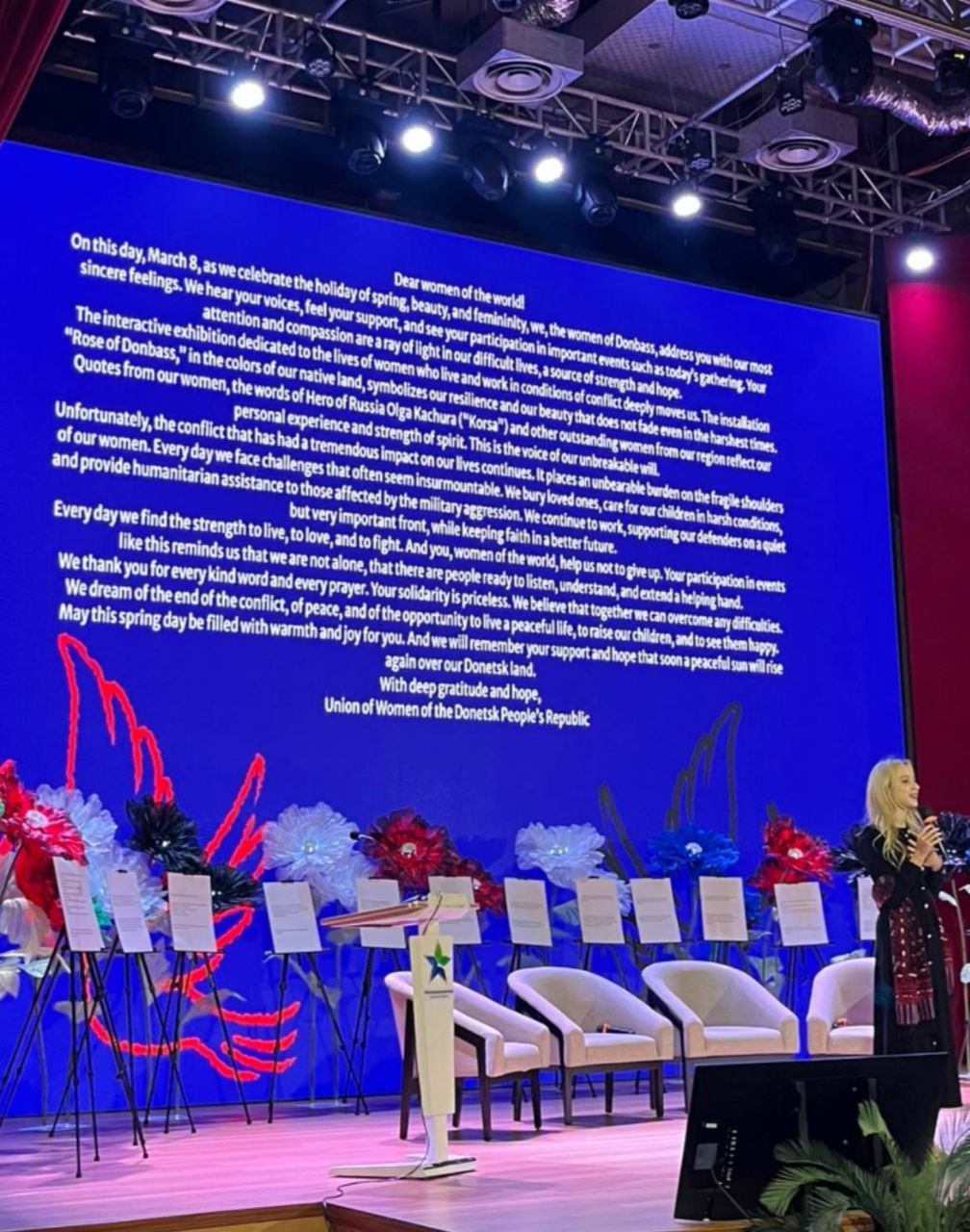Особое место было отведено инсталляции «Роза Донбасса», которая стала выражением солидарности с женщинами Донецкой Народной Республики, проявляющими невероятную стойкость в условиях продолжающейся агрессии. Здесь прозвучали слова Ольги Качуры «Корсы» — легендарного командира артиллерийского дивизиона ДНР, Героя Российской Федерации, чьё мужество и самоотверженность стали примером для многих.