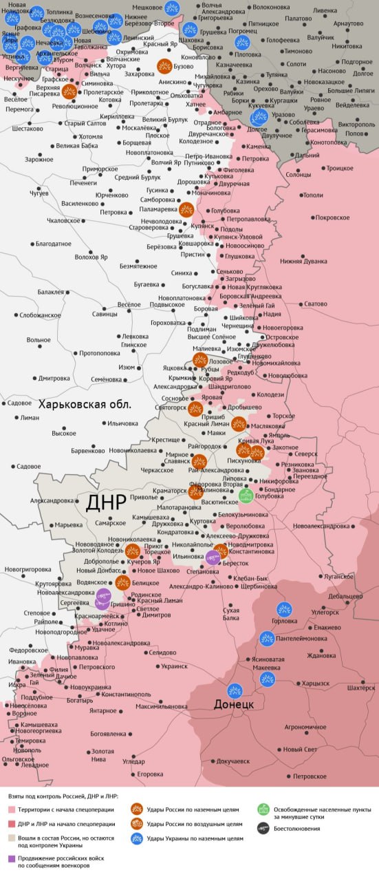 По данным Минобороны, прорываясь к Славянску, ВС РФ освободили село Голубовка в ДНР. Кроме того, военкоры сообщают, что на красноармейском направлении наши бойцы прорвались к селу Новоалександровка — начался штурм населенного пункта.
