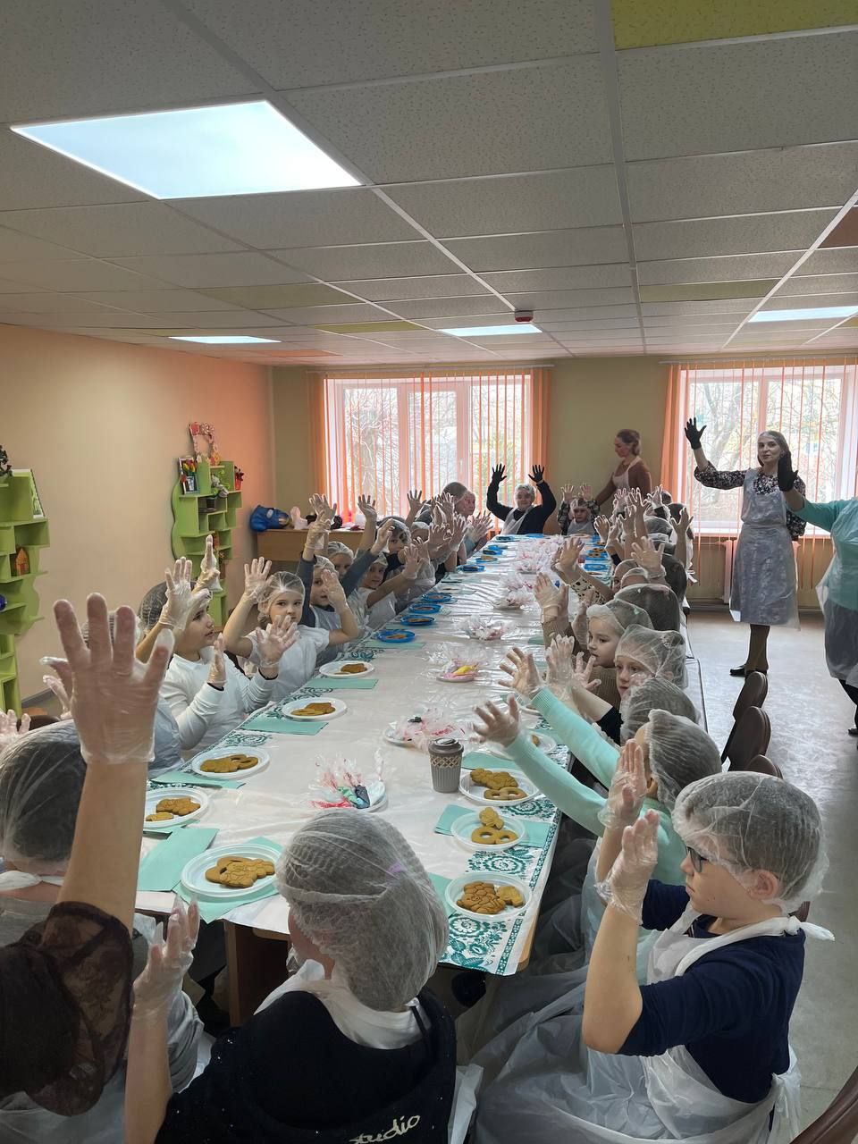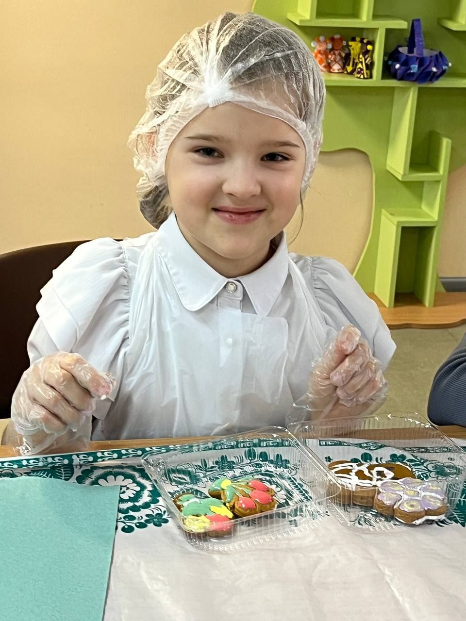 Перед началом работы юные участники мероприятия познакомились с техникой и возможными вариантами росписи, надели шапочки, фартуки и перчатки, и приступили к творчеству.