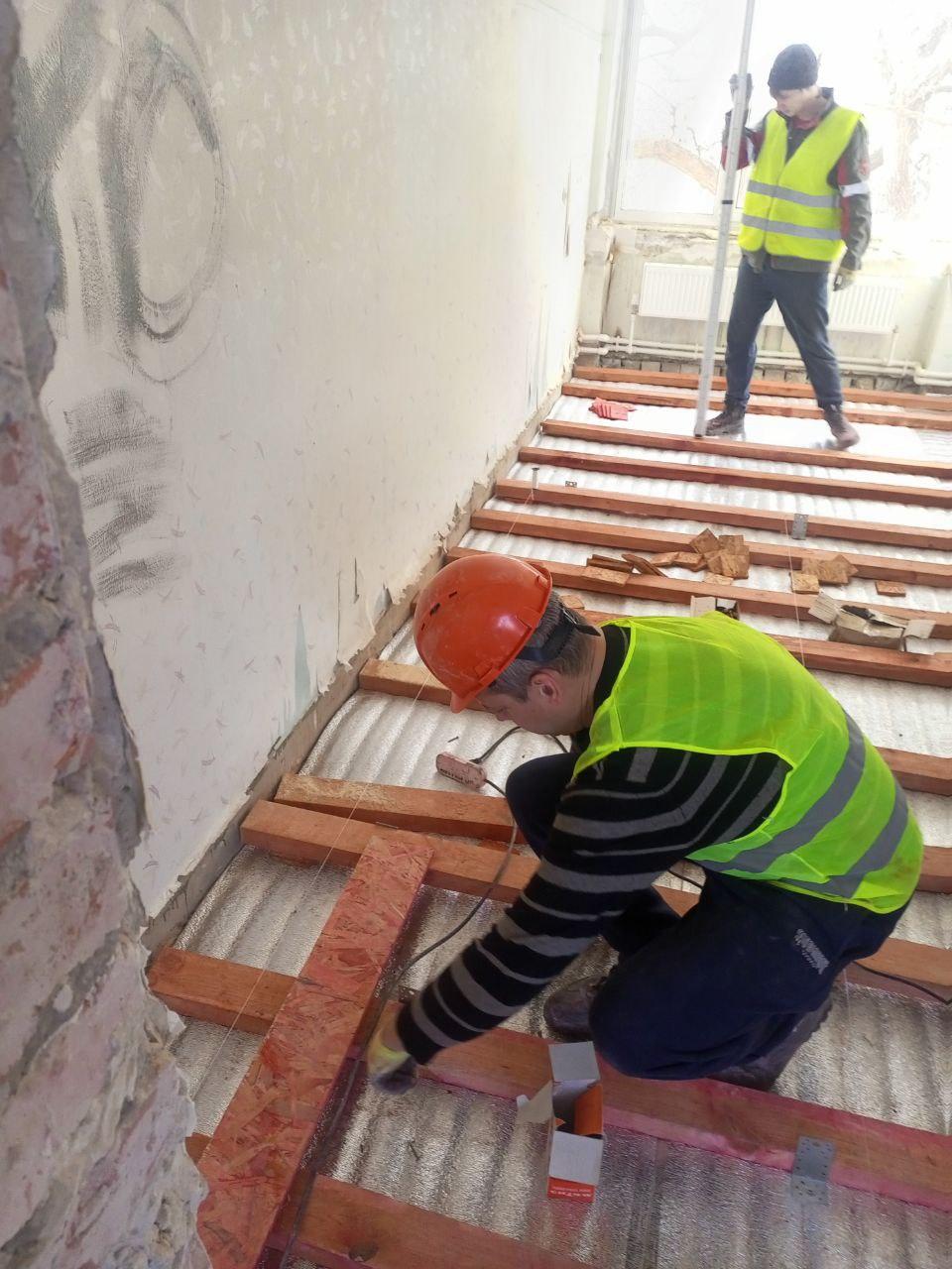 Основная задача — комплексное обновление двух корпусов школы, что позволит создать по-настоящему комфортную и современную образовательную среду. На объекте задействована бригада из 13 человек. Рабочие выполняют демонтаж подсыпки с чердачного помещения, занимаются устройством полов и демонтажем старой кровли. Помимо этого, проводится монтаж новой стропильной системы и обустройство навеса над входом в здание.