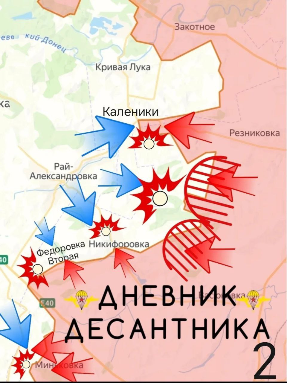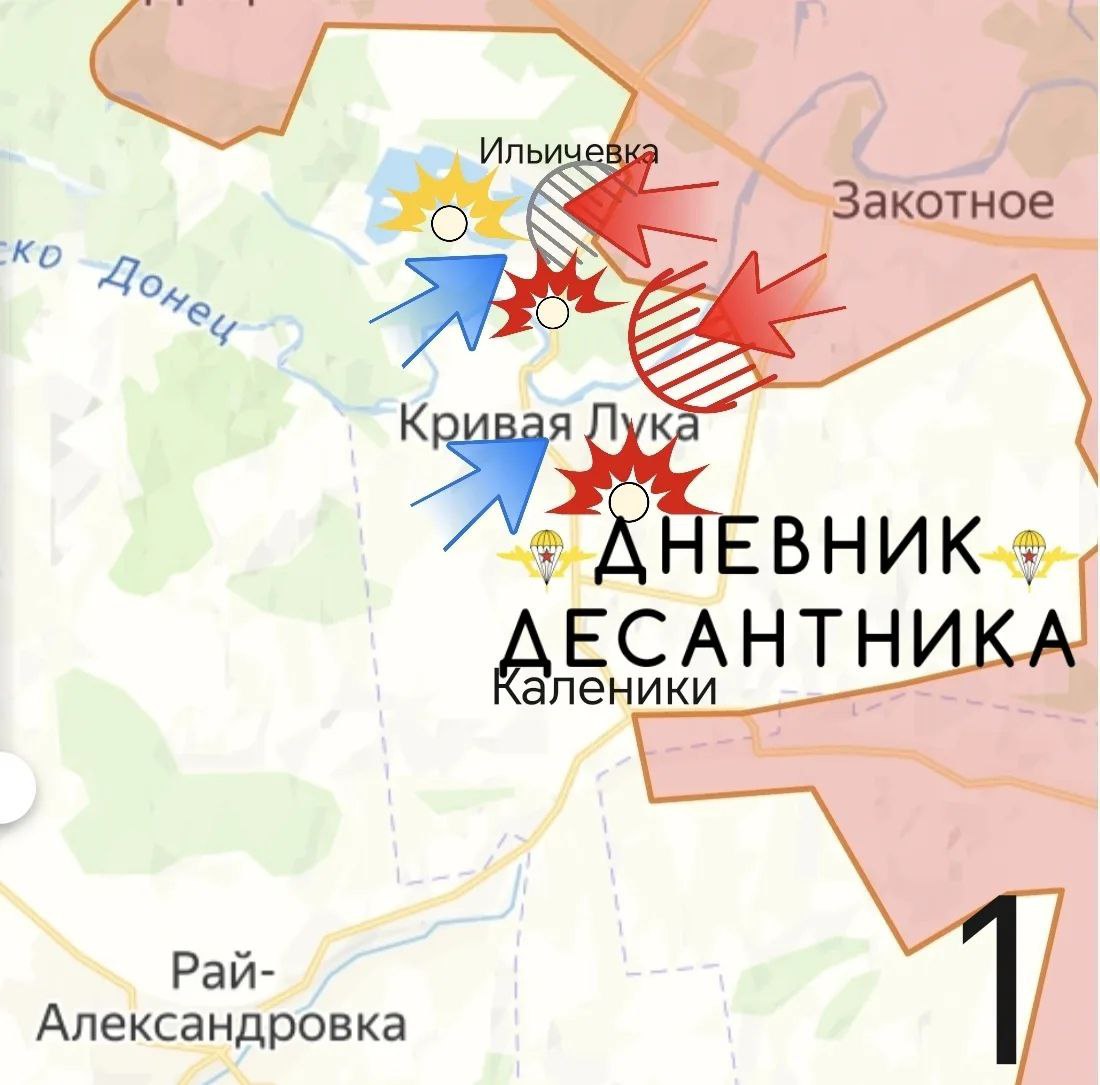 На юго-западе Ильичевки (Озерного) обрабатываем противника в районе бывшей военной базы. В восточной части села пока нет уверенного контроля ни у одной из сторон. Окрас - "серая зона";Район Кривой Луки. Северо-восточнее населённого пункта наши воины успешно заняли ключевой меловый склон и подошли к селу. Это продвижение обеспечило тактическое преимущество силам ВС РФ. Отсюда удобнее вести наблюдательный контроль за прилегающей местностью;