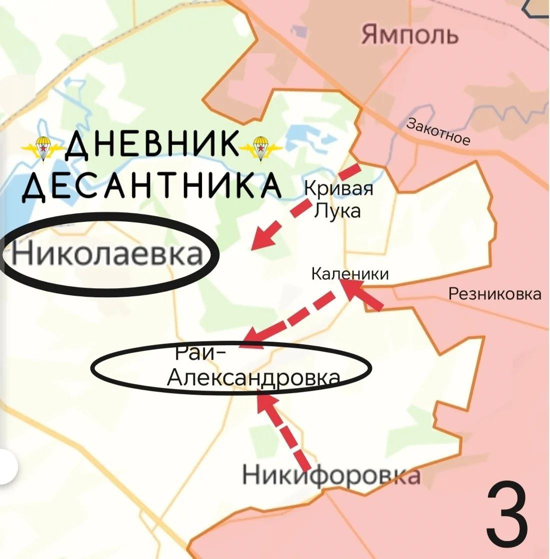 Отсюда, с южного участка развиваем наступление в сторону Рай-Алексанровки - последнего важного логистического узла и крупного укрепрайона ВСУ на направлении (карта 3). Дальше выходим на оперативный простор до Николаевки.
