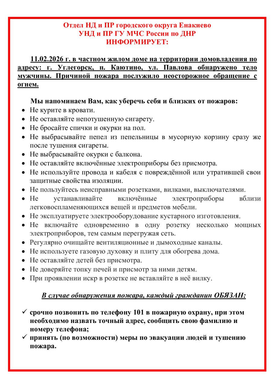 11 февраля в городе Углегорске, в поселке Каютино, на территории частного домовладения, расположенного по улице Павлова, произошел пожар. Оперативно прибывшие на место происшествия пожарные подразделения в ходе разведки установили горение кровли и задымление внутри дома по всему объему. В результате осмотра дома в помещении кухни было обнаружено тело мужчины. Предварительная причина пожара — неосторожное обращение с огнем.
