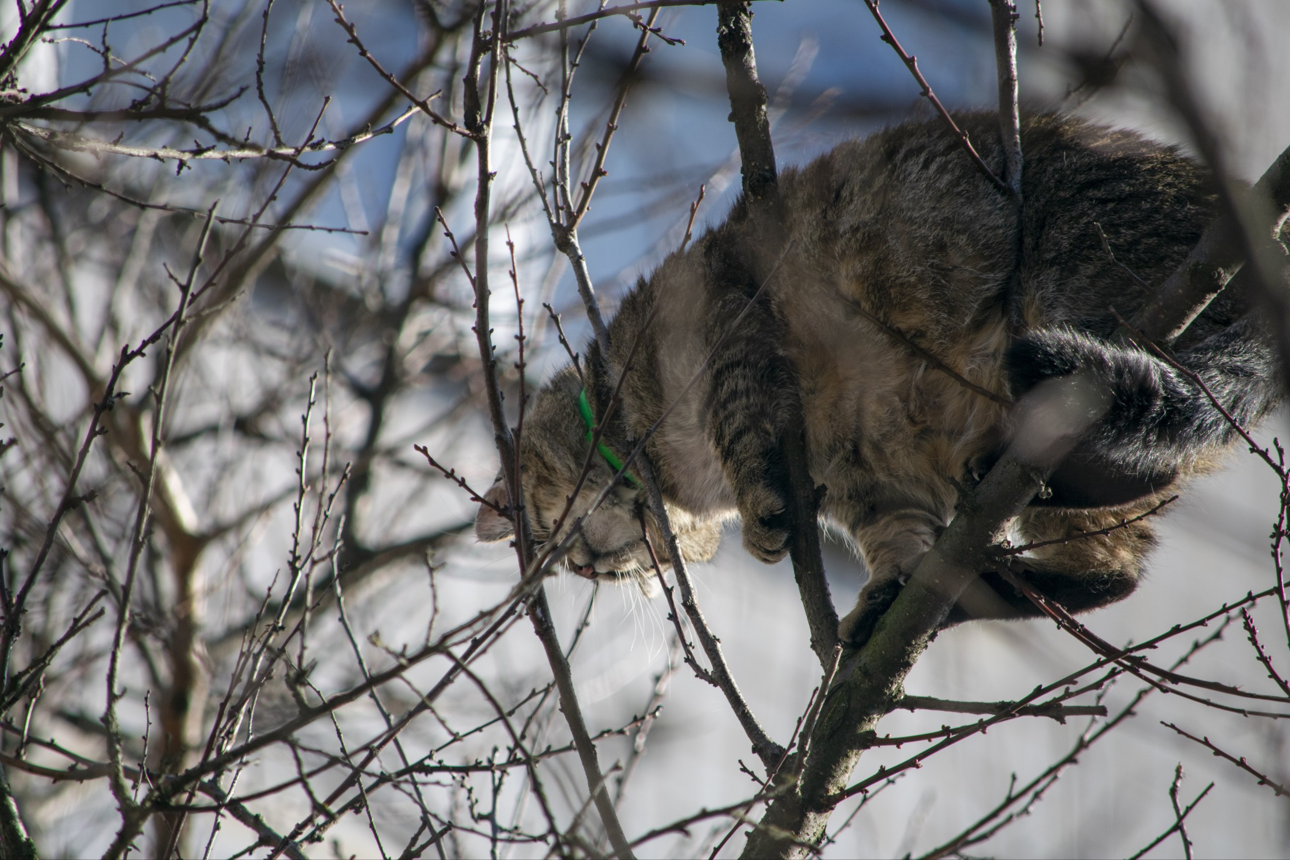 Родственник Чеширца, к сожалению, не умеет телепортироваться и, оказавшись столь высоко, вдруг обнаружил, что не может спуститься на землю. О своем незавидном положении пушистик стал громко сообщать на всю округу и был услышан неравнодушными жителями, которые и обратились к нам.