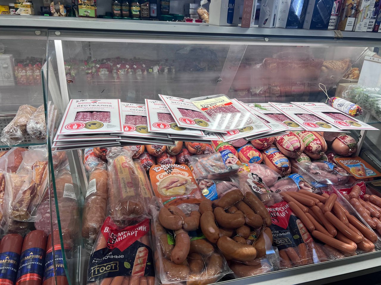 В торговом зале молочная продукция размещена в непосредственной близости с мясной продукцией. Данное размещение не обеспечивает раздельное хранение пищевых продуктов и создаёт риск перекрёстного загрязнения.