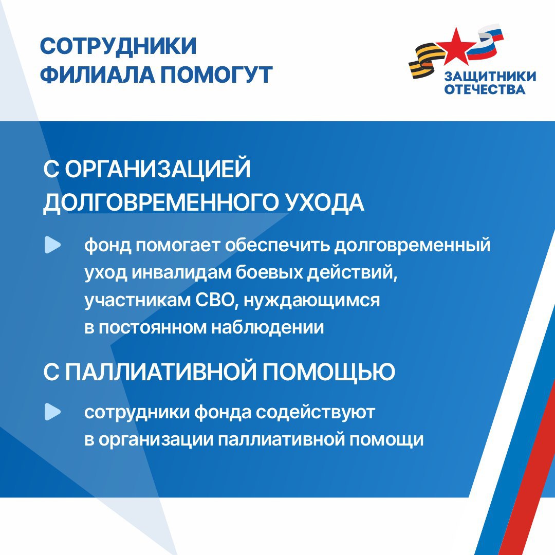 Государственный фонд «Защитники Отечества» помогает ветеранам СВО получить медицинскую помощь, сопровождение, направление на санаторнокурортное лечение, пройти углубленную диспансеризацию, медицинскую реабилитацию...