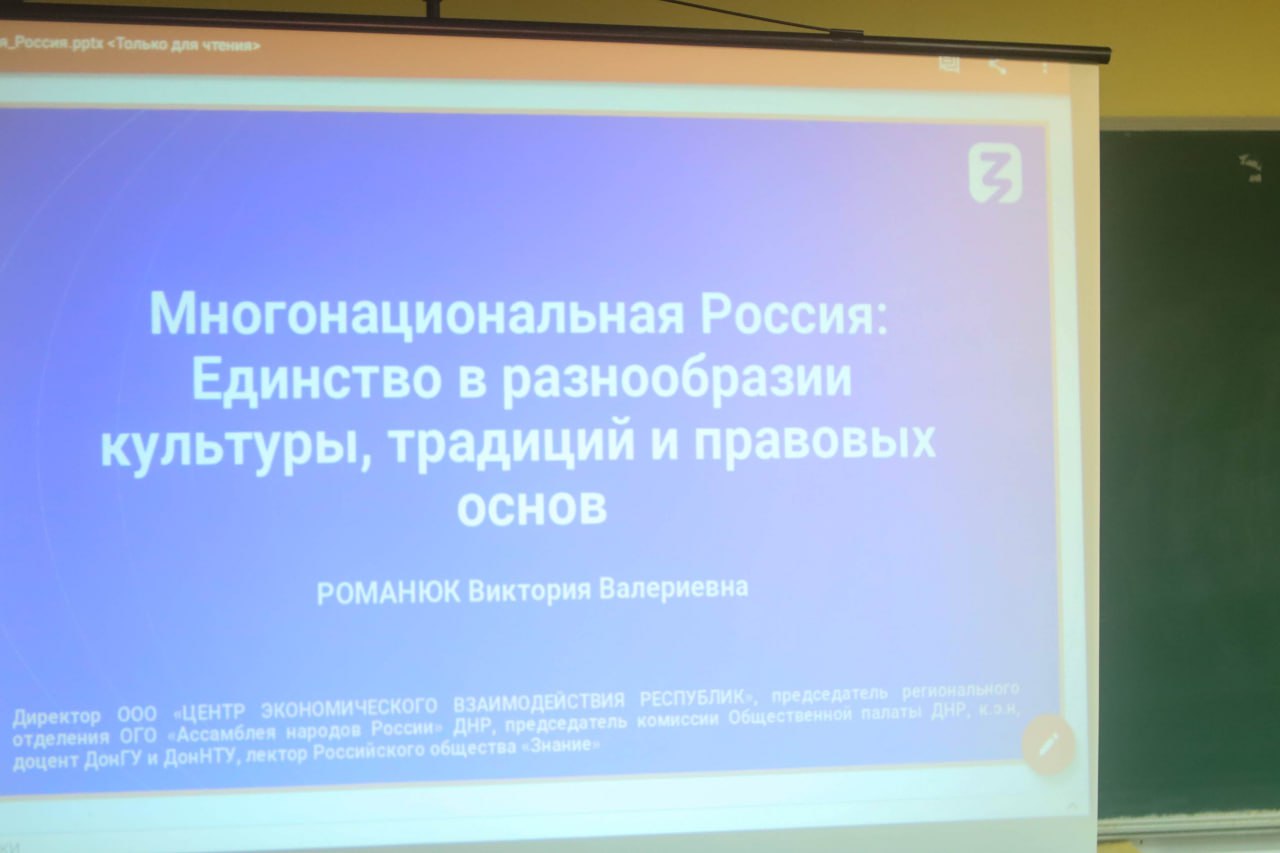 Первой, при поддержке Российского общества «Знание», стала лекция члена Общественной палаты ДНР, Председателя Регионального отделения «Ассамблеи народов России» в ДНР Виктории Романюк для студентов Донецкого государственного медицинского университета Минздрава России.