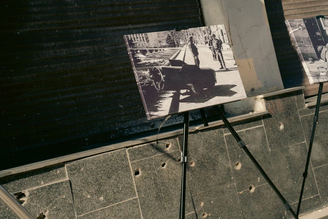Кроме баннера, подготовленного молодежью, и цветов, на месте трагедии сегодня стояли фотографии корреспондента Дениса Григорюка, сделанные им в первые часы после обстрела.