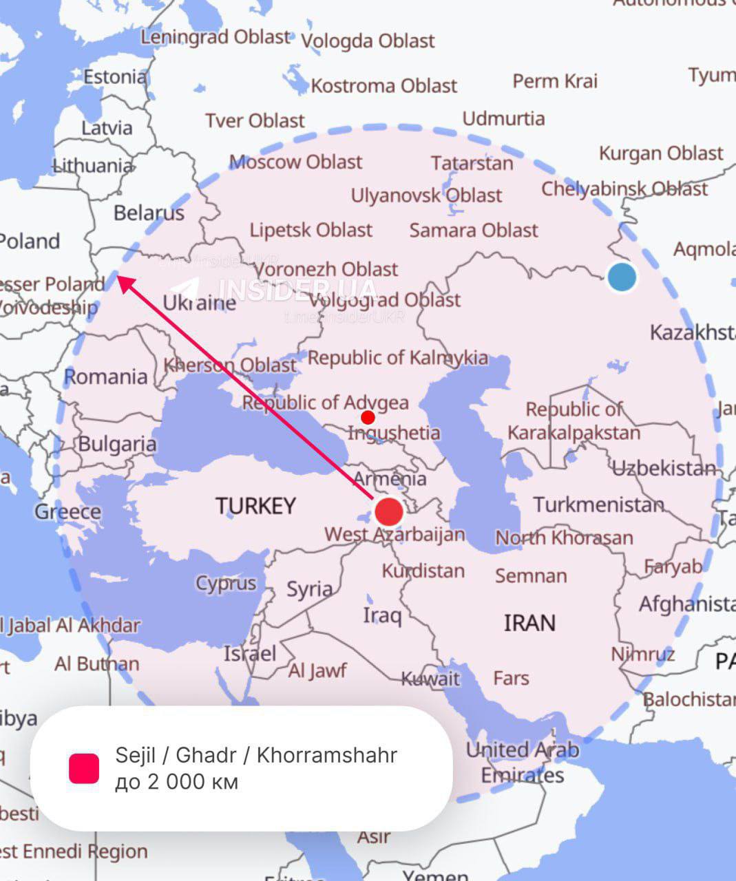Карта* с дальностью иранских ракет
