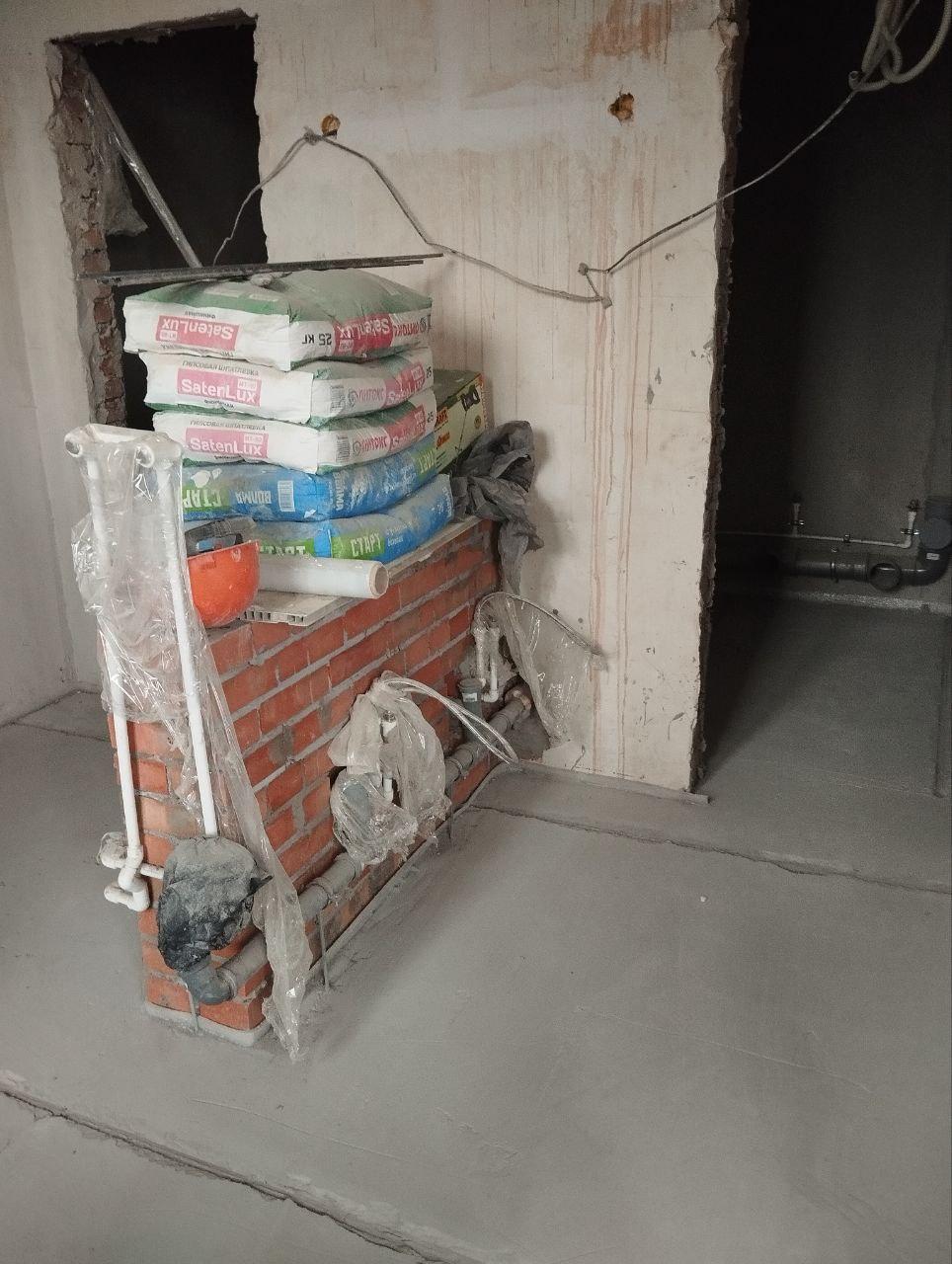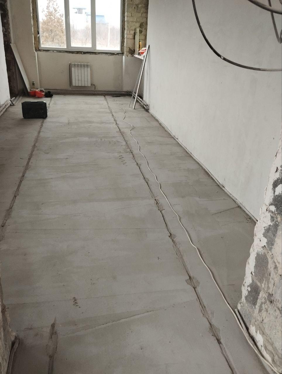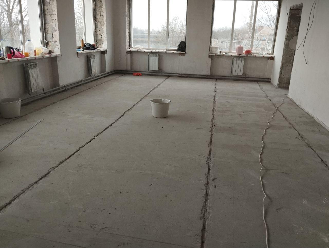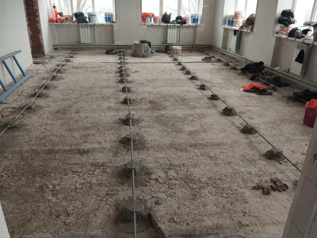 Новое основание уже готово в части комнат, в других специалисты ведут подготовительные работы: выравнивают поверхность, устраивают многослойную подушку и наносят грунтовку.