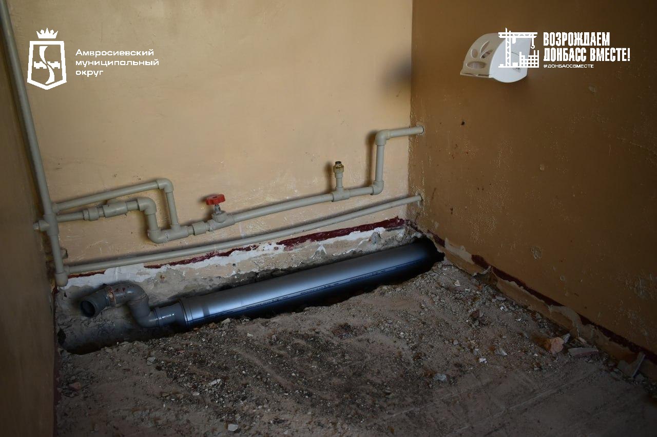Регион-шеф выполнил демонтаж старой канализации. Специалисты ведут работы по укладке новых труб, а также заливку и выравнивание пола в помещениях.