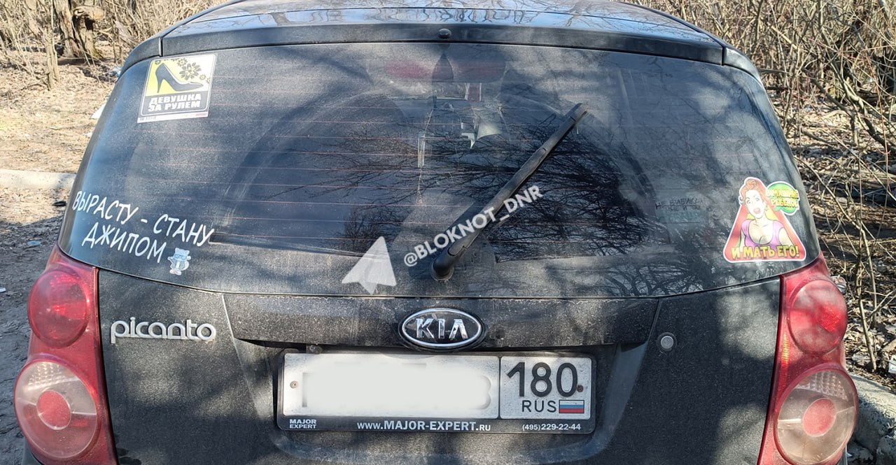 «В машине ребенок и мать его!», «Не бибикай, мне и так страшно», – гласят наклейки на малюсеньком KIA.