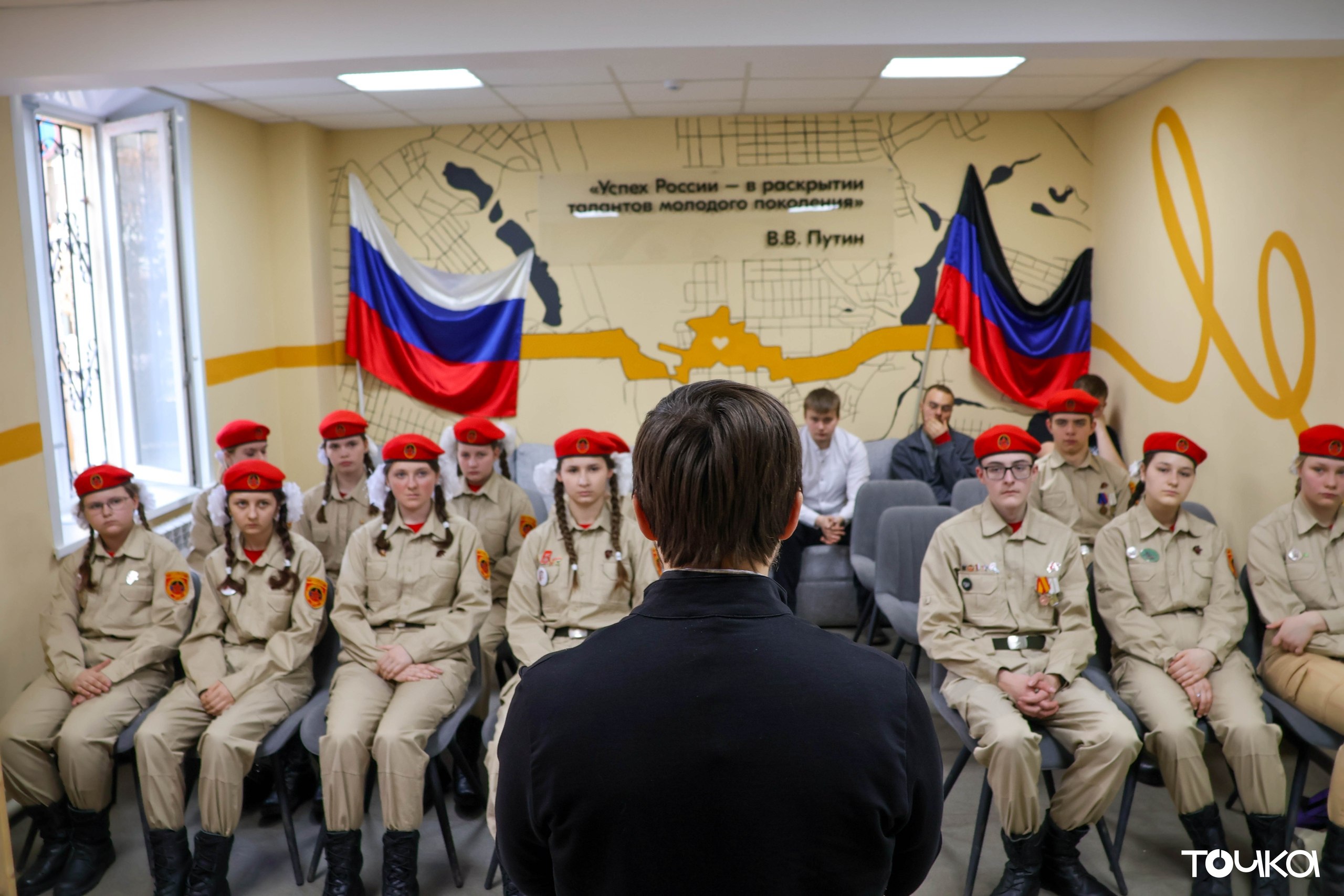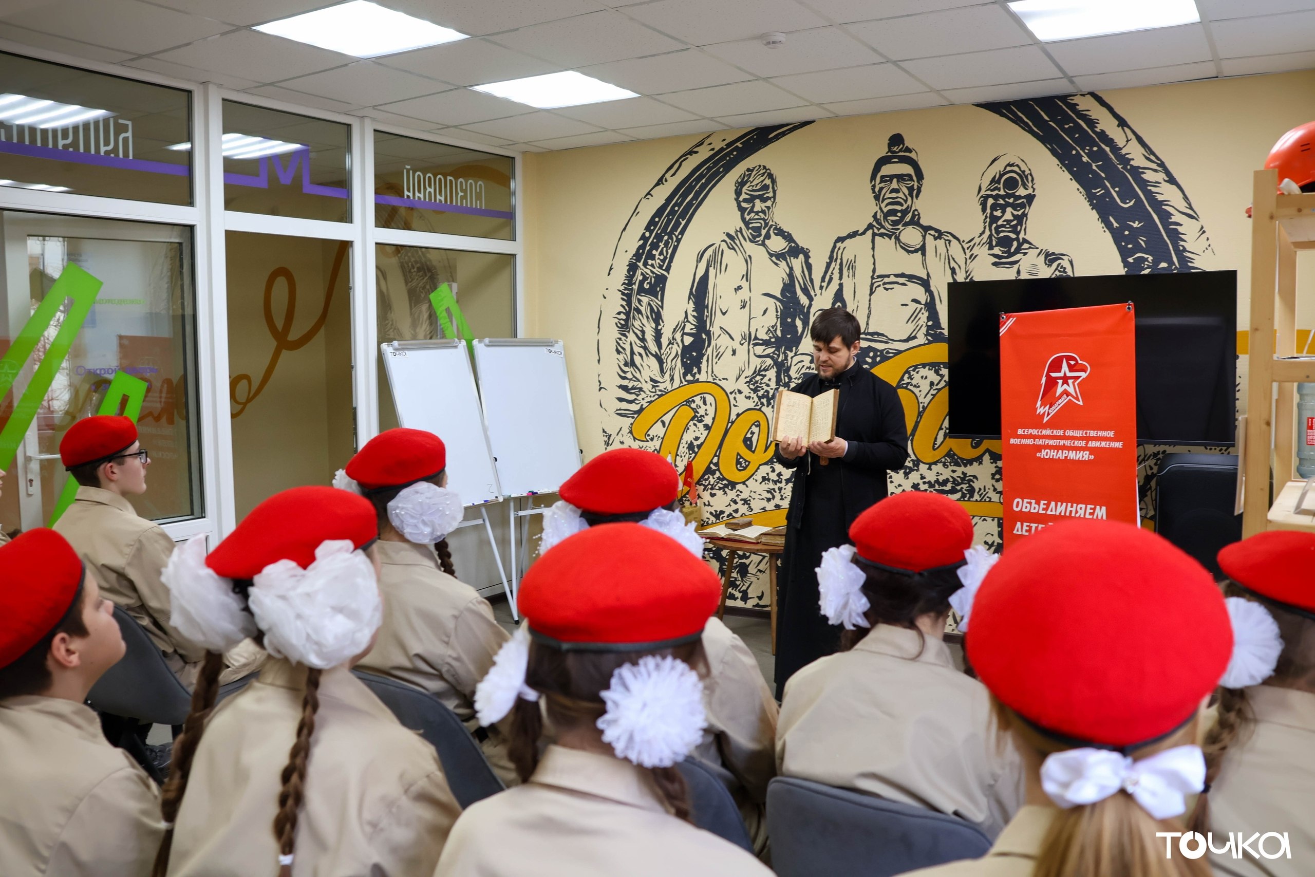 В преддверии Дня православной книги в молодёжном пространстве «Точка» состоялась встреча в рамках акции «С верой в сердце» юнармейцев местного отделения городского округа Макеевка с отцом Евгением — настоятелем СвятоНиколаевского храма.
