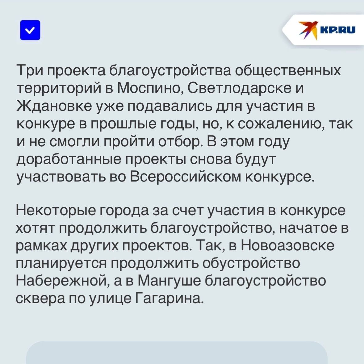 С 2022 по 2025 годы 13 наших проектов стали победителями. Три проекта – в Волновахе, Снежном и Шахтерске - уже завершены, работы по пяти - в Докучаевске, Енакиево, Торезе, Харцызсе и Ясиноватой - завершат в этом году, и еще по пяти проектам – в Новоазовске, Иловайске, Зугрэсе, Кировском и Ялте - работы выполнят до конца 2027 года, - рассказал «Комсомолке» министр строительства, архитектуры и ЖКХ ДНР Владимир Дубовка.