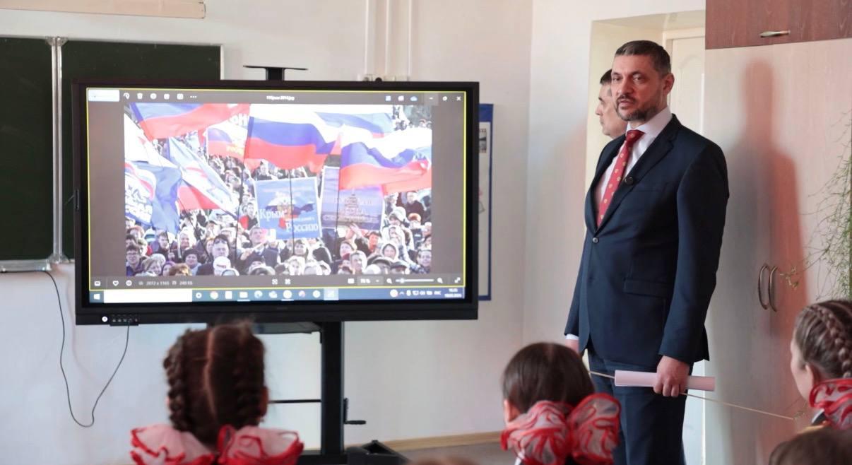 В день воссоединения Крыма с Россией губернатор региона-шефа Александр Осипов провел открытый урок для школьников. Участниками занятия стали ребята из Комсомольской школы №1 Старобешевского округа и кадеты школы-интерната региона.