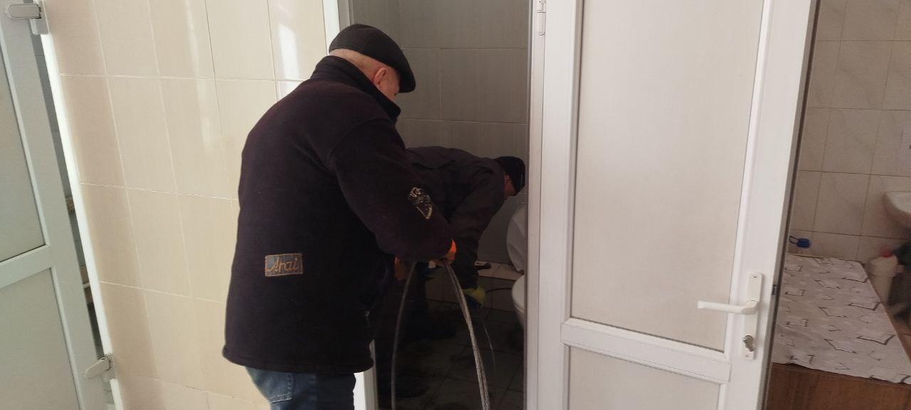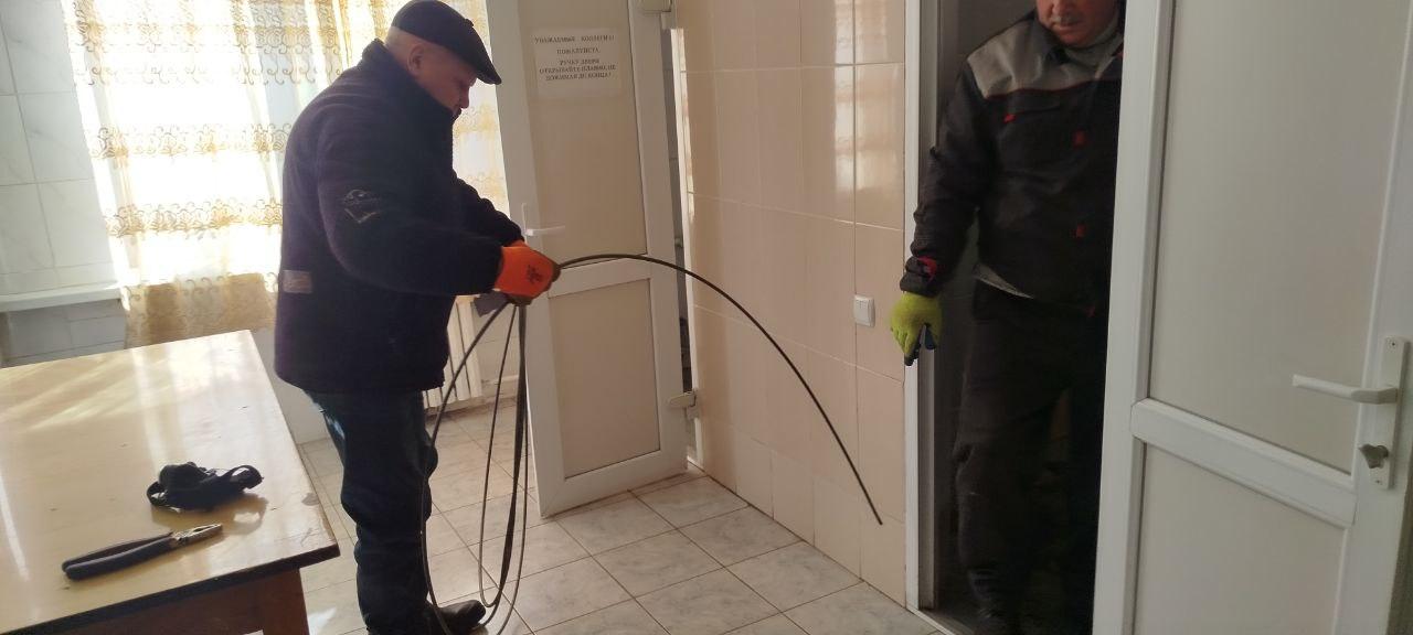 По запросу бригада рабочих выполнила прочистку канализации с помощью гибкого металлического вала с рукояткой.