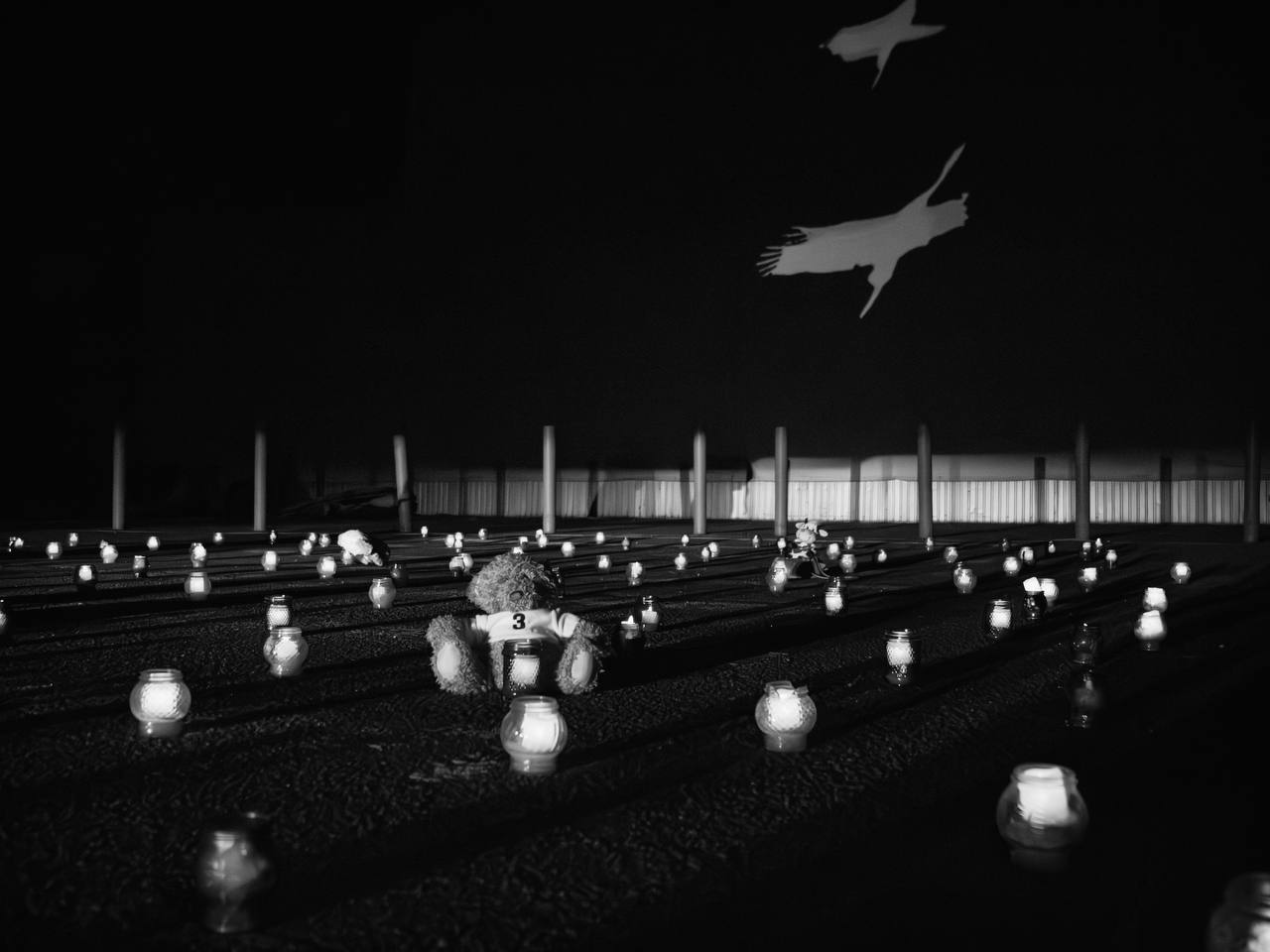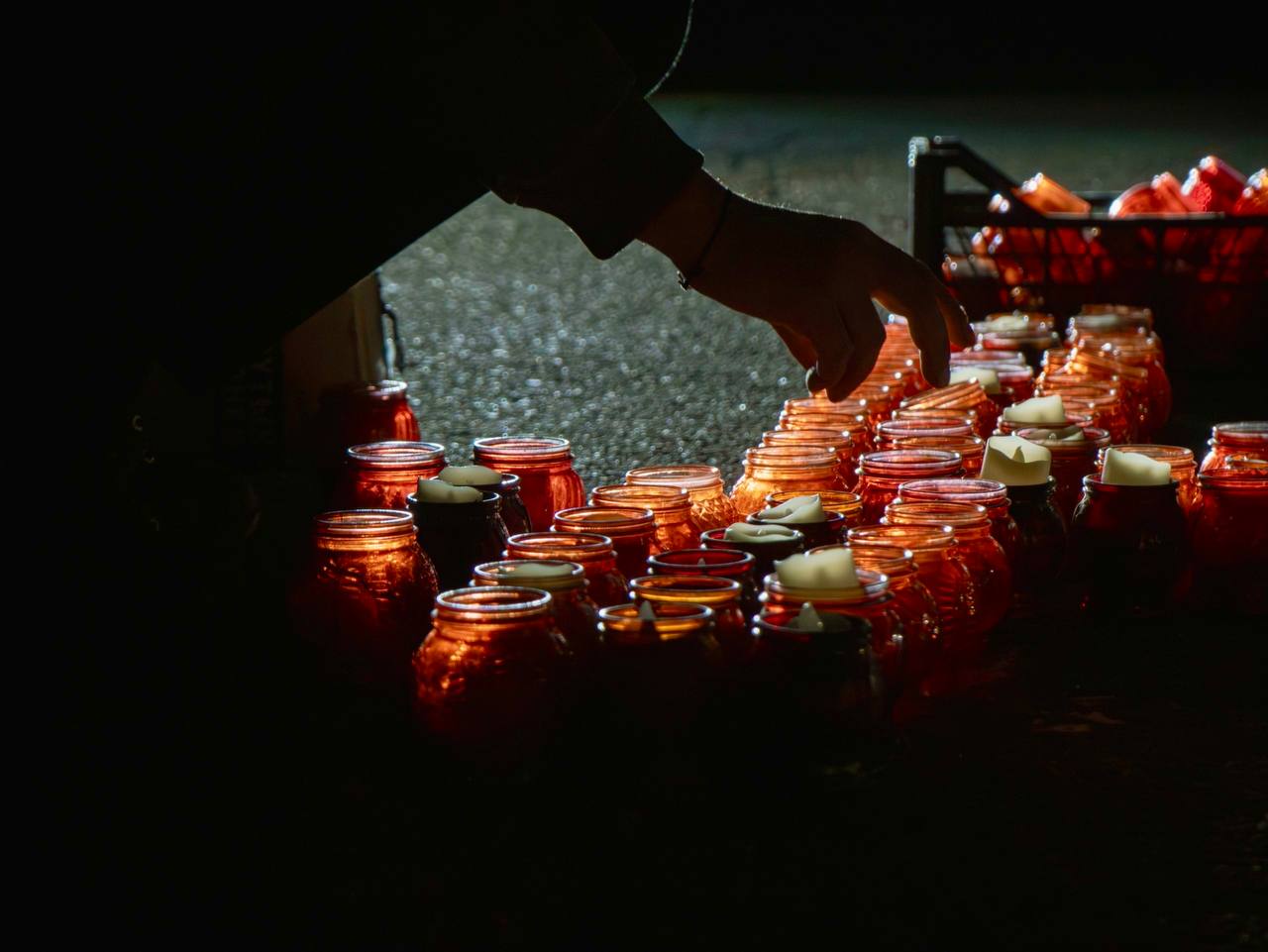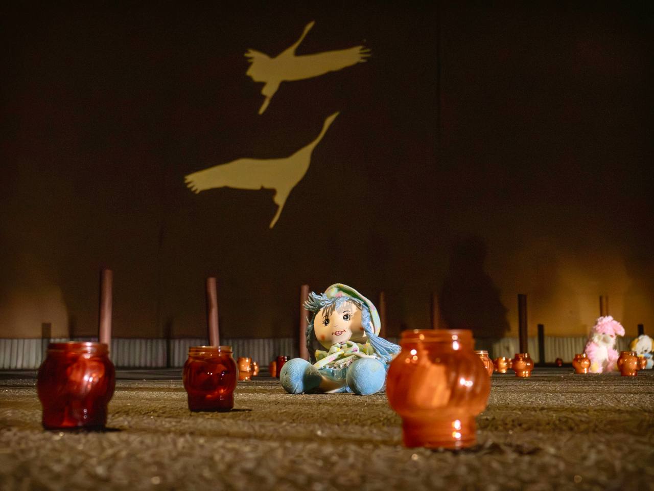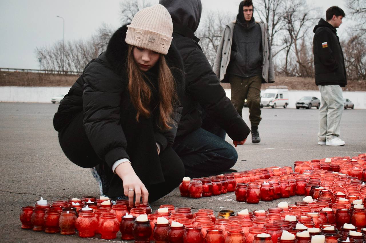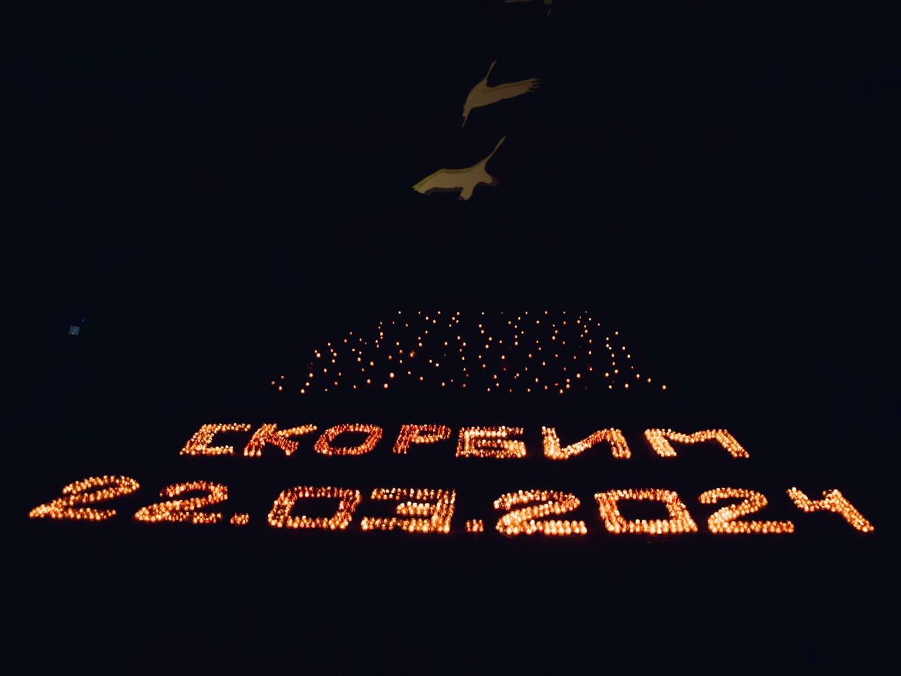 Образ летящих журавлей, «Скорбим 22.03.2024» из 2 500 лампадок, 150 свечей, олицетворяющих душу каждого невинно убиенного, и минута молчания. Так молодёжь ДНР почтила память жертв теракта в Крокусе на месте сожённого украинскими террористами ТЦ «Сигма».