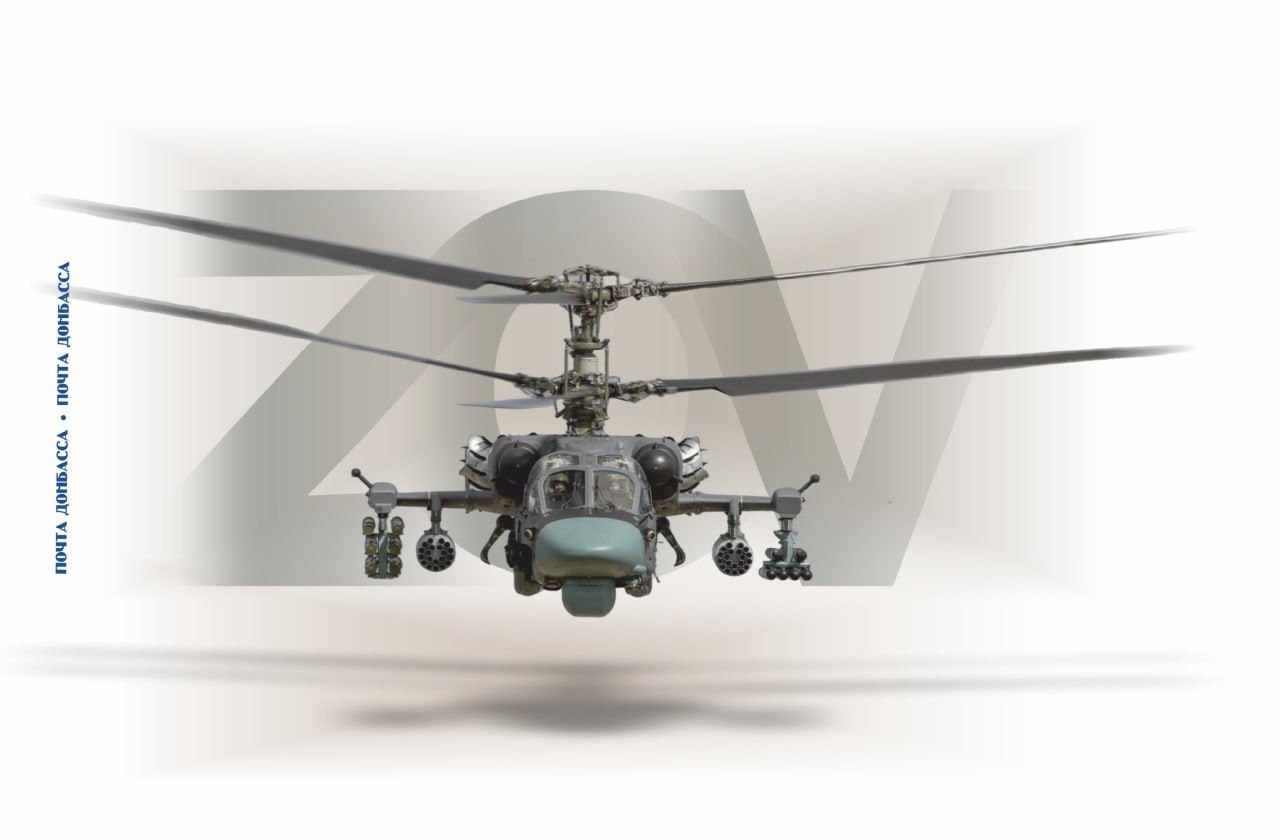 «Почта Донбасса» выпустила новые конверт и виньетку с изображением техники СВО - боевого разведывательно- ударного вертолета Ка-52, известного во всем мире как «Аллигатор»