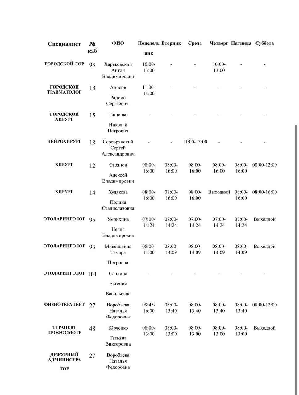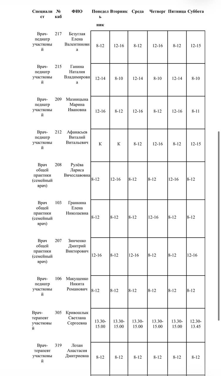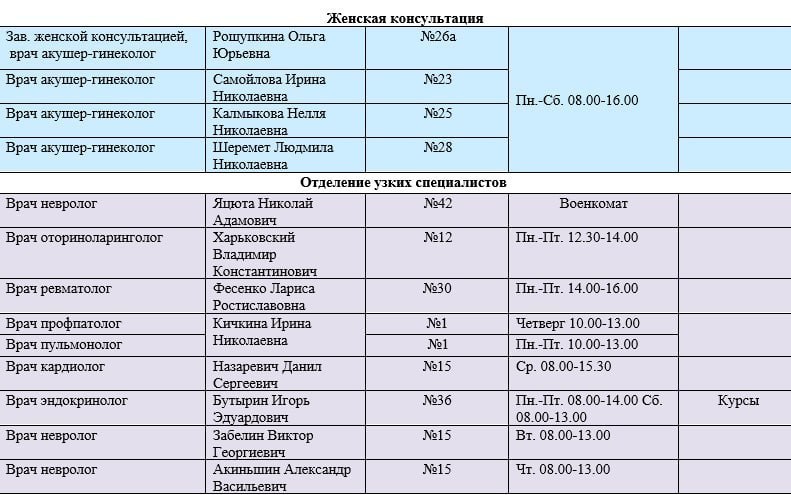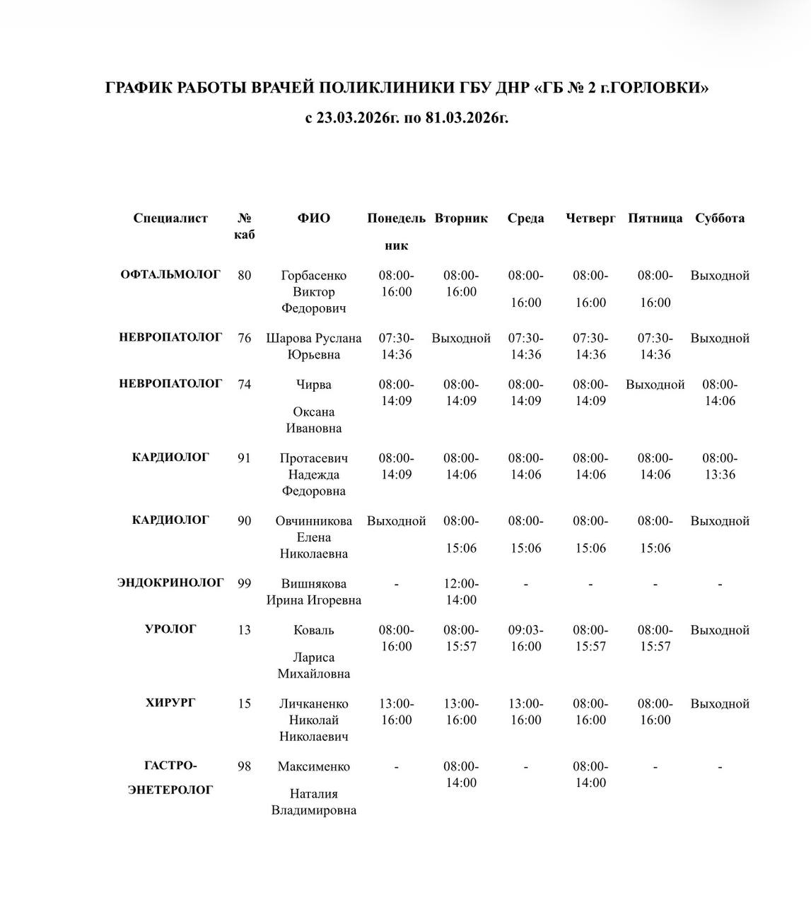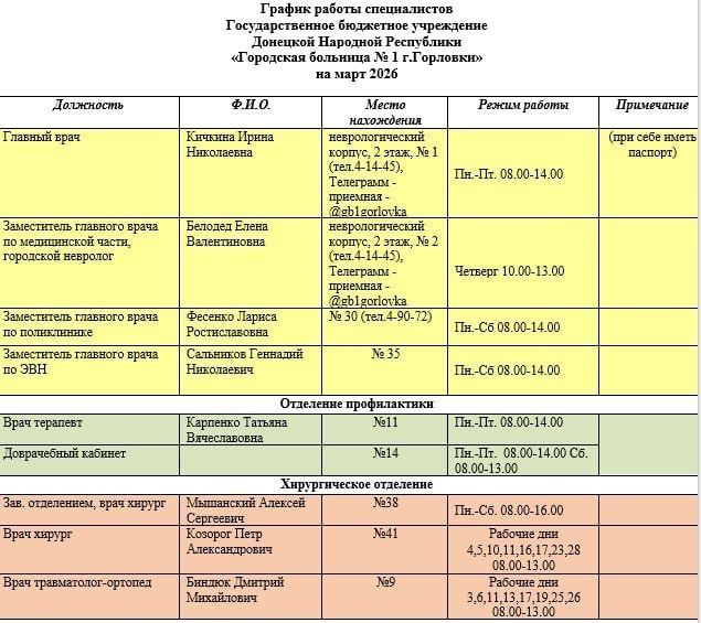 Иван Приходько: График работы специалистов ГБУ ДНР «Городская больница № 1 г. Горловки», ГБУ ДНР «Городская больница № 2 г. Горловки»