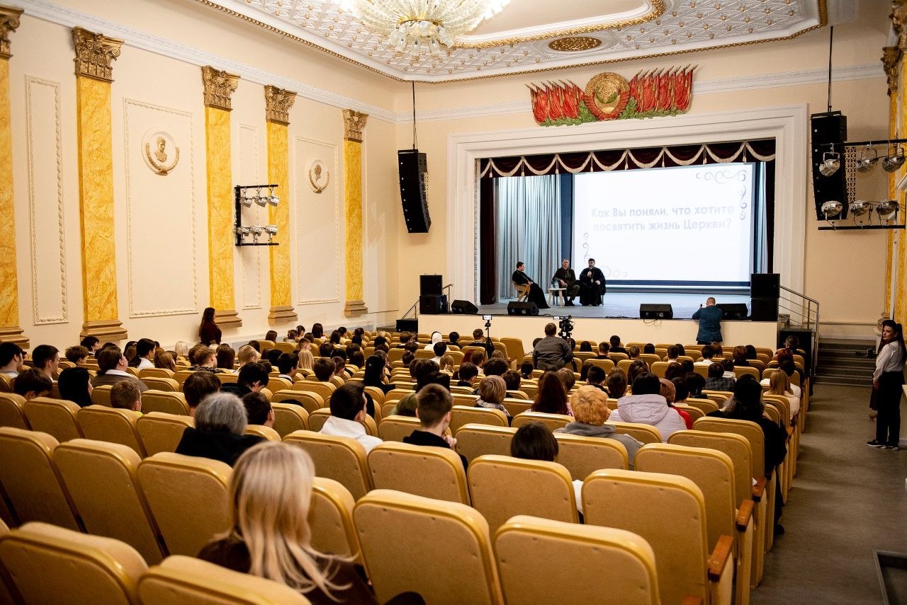 Встреча со студентами средних специальных учебных заведений города прошла при содействии Управления культуры, молодёжи, спорта и туризма городской администрации, со стороны епархии мероприятие готовил миссионерский отдел.