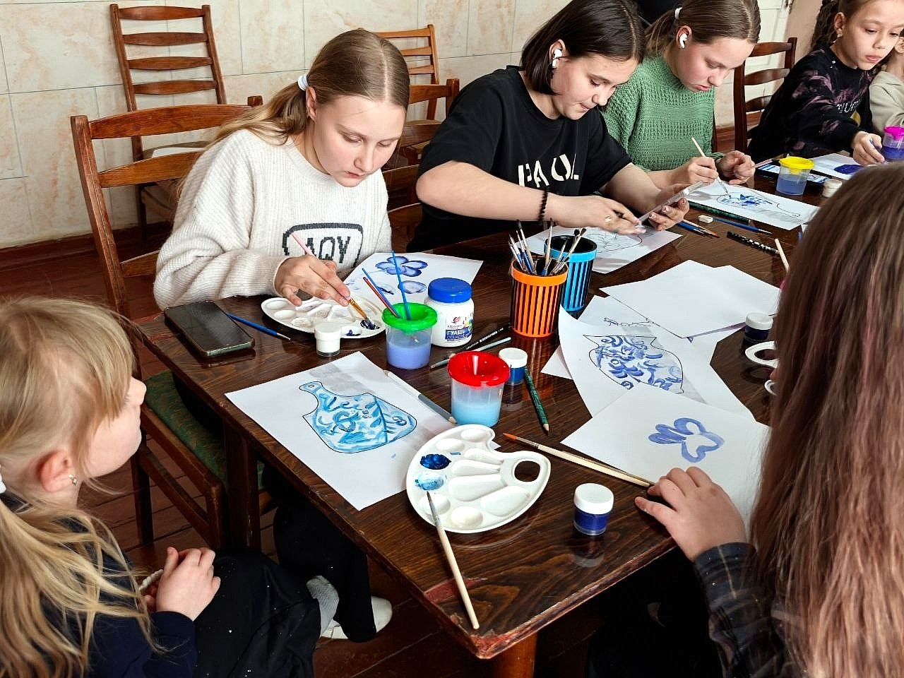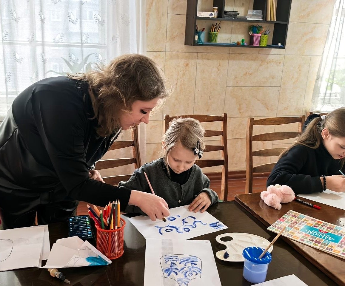 Сегодня юные художники ДК им. 40 - летия ЛКСМУ доказали: даже на бумаге можно воплотить волшебство синебелых узоров! В рамках Года единства народов России ребята познакомились с гжельской росписью и создали свои версии традиционных изделий: вазы, самовары и разделочные доски с традиционными синебелыми узорами.