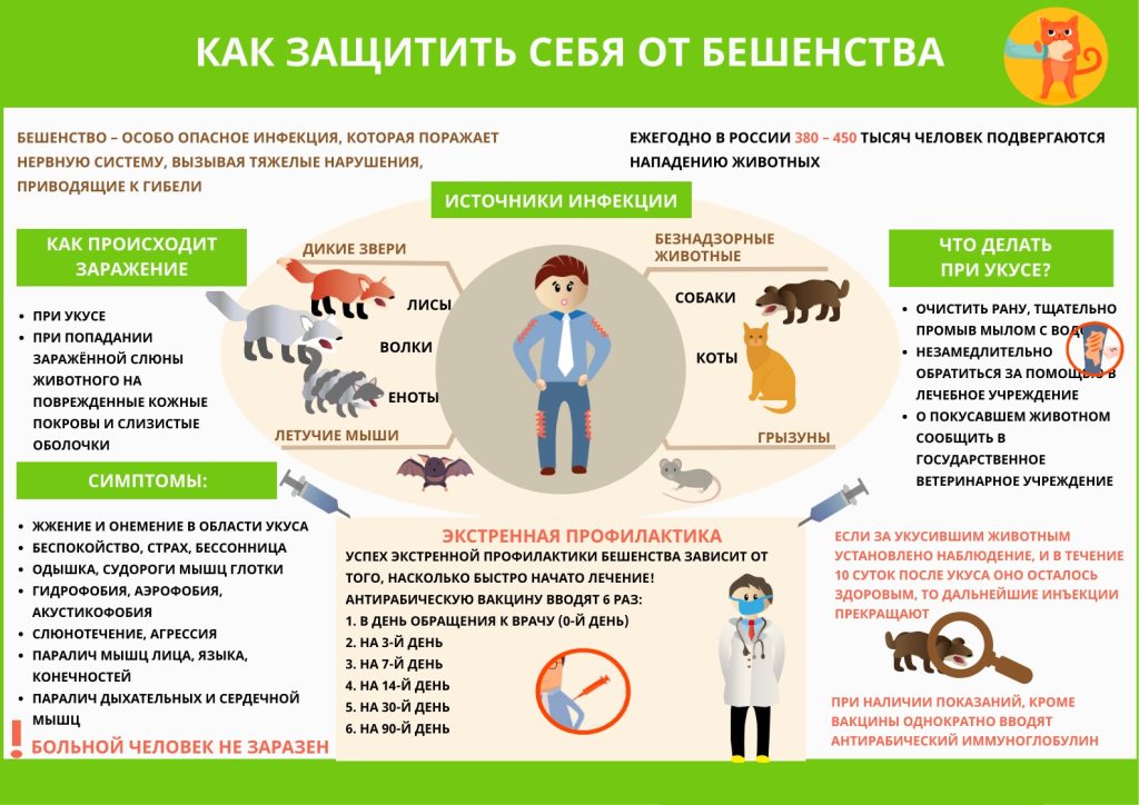 При любом укусе или ослюнении немедленно обращайтесь к врачу: своевременная вакцинация спасает жизнь.