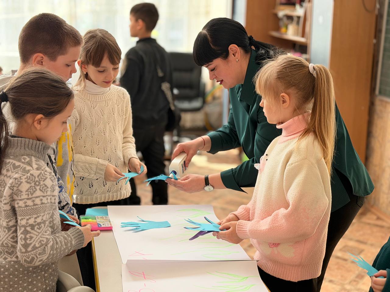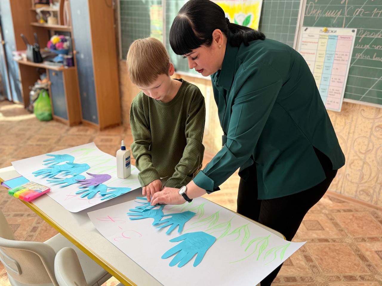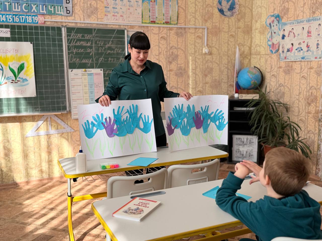 Чтобы закрепить знания, депутат предложила школьникам создать свою собственную «поляну первоцветов». Ребята с огромным энтузиазмом включились в процесс: вырезали из цветной бумаги свои ладошки и приклеивали их на импровизированную полянку.
