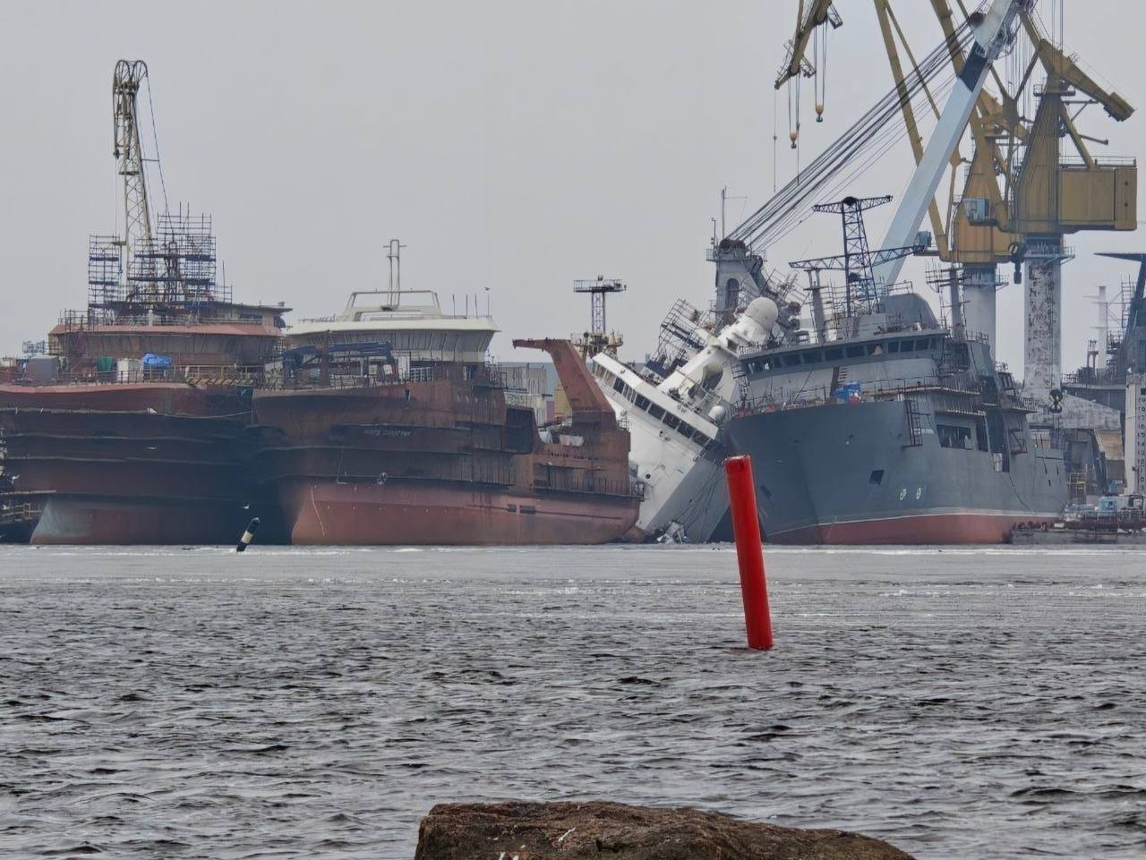 Военкоры сообщают, что новейший пограничный корабль ледового класса проекта 23550 — предположительно «Пурга» (по другим версиям — «Ермак» или «Дзержинский» того же проекта) — дал крен на левый борт и столкнулся надстройкой с соседним судном. Корабль строился для погранслужбы ФСБ.