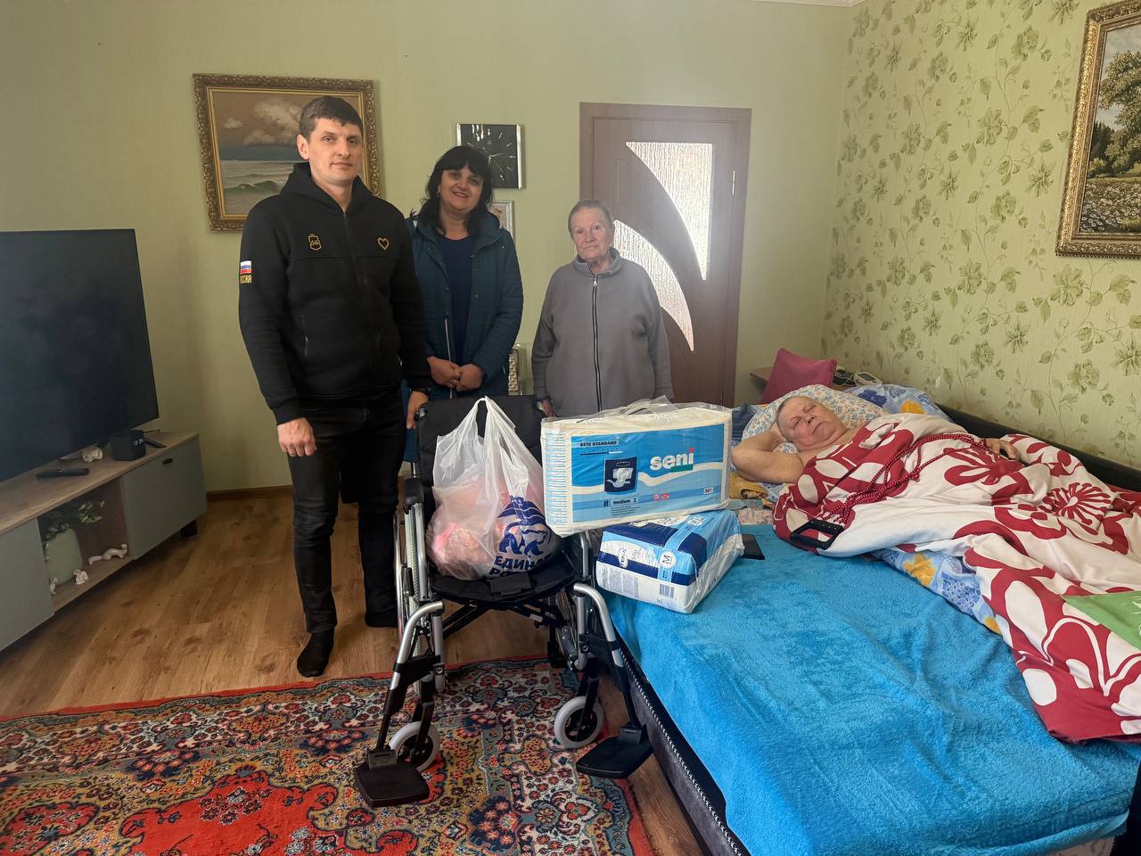 В рамках визита ветерану была передана инвалидная коляска, памперсы и продуктовый набор. Помощь оказана с учётом индивидуальных потребностей, чтобы поддержать здоровье и бытовые условия человека, посвятившего свою жизнь служению другим.