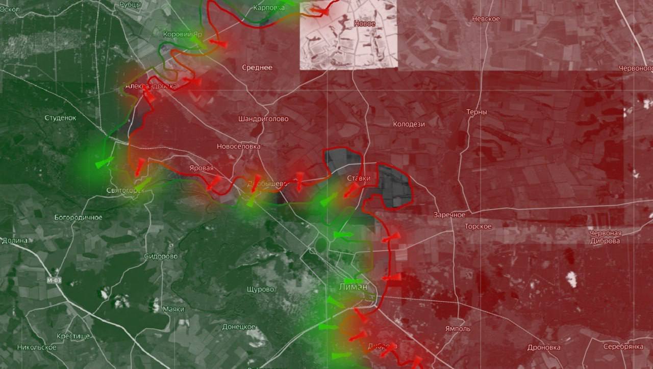 «На Лиманском направлении в течение первой половины марта российские войска захватили значительную часть Яровой и Дробышево, закрепившись в застройке сёл. Параллельно с этим они заняли новые позиции на подступах к Святогорску и Крымкам, а также завязали бои за Александровку.