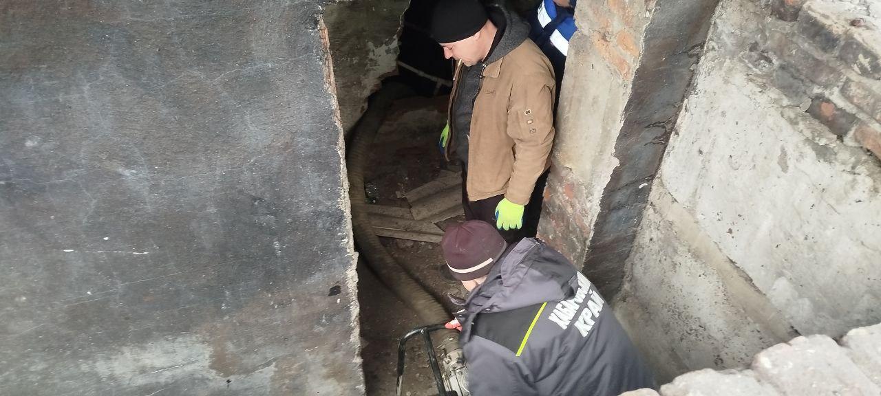 Группа сотрудников аварийно-восстановительной бригады региона-шефа провели откачку воды из подвала с помощью погружного насоса для сильнозагрязненной воды.