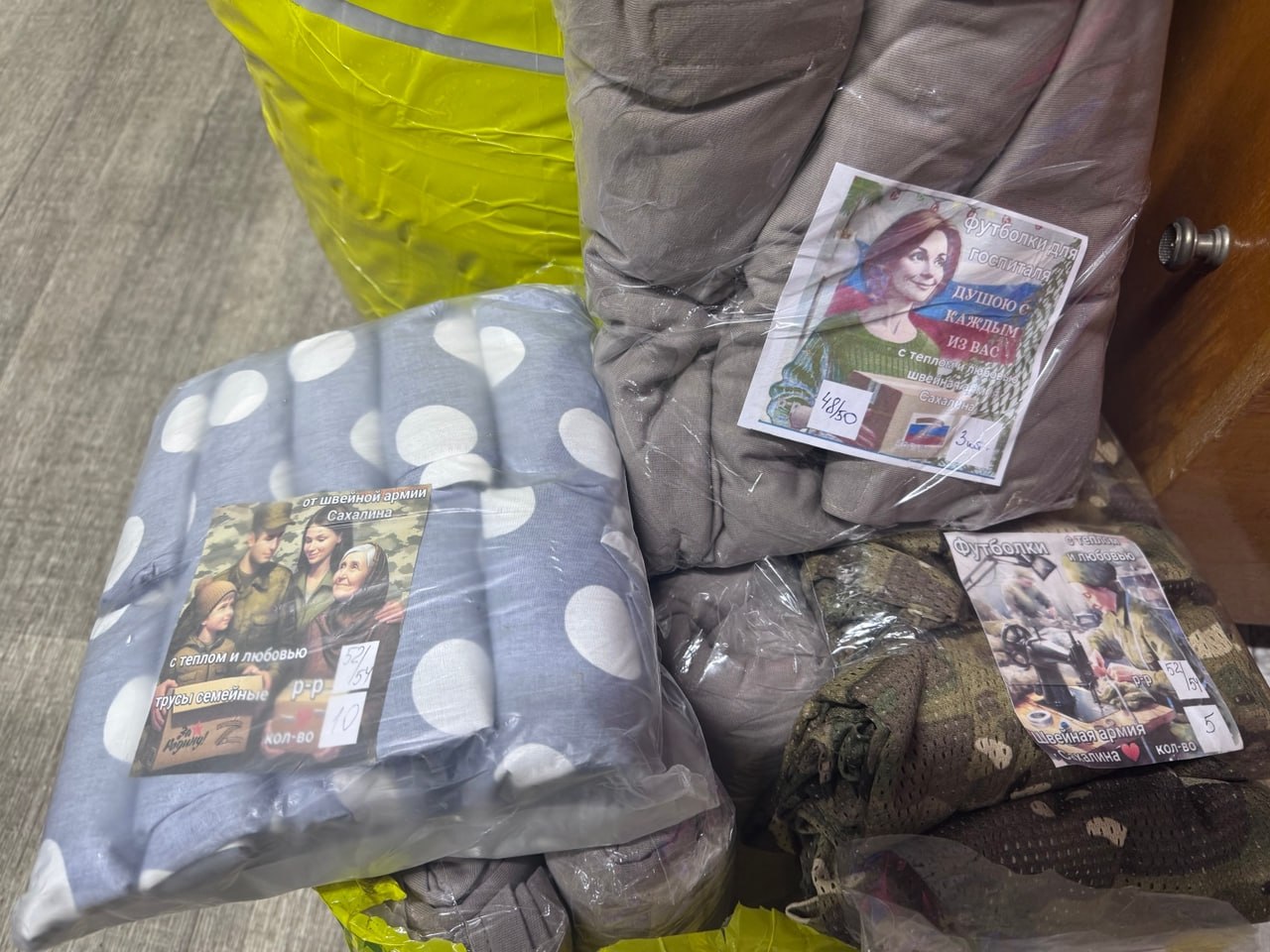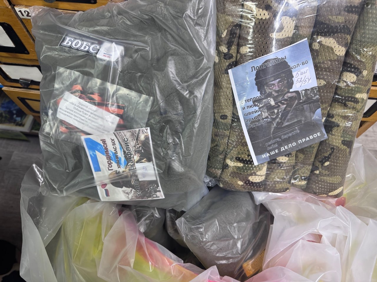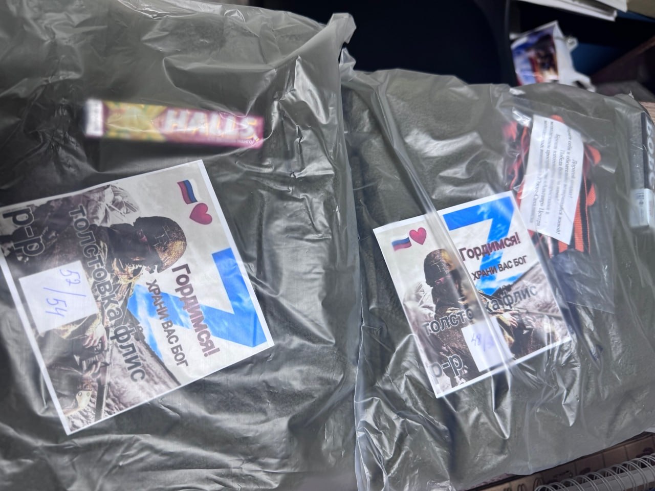 Для наших воинов-защитников — всё самое нужное: бельё, носки, тёплые флисовые толстовки. В каждый пакет наши подруги вложили не просто вещи, а частичку своей души: леденцы — чтобы немного сладости в суровых буднях, записки с тёплыми словами — чтобы знали, что их ждут, и самодельные обереги — с верой и молитвой.