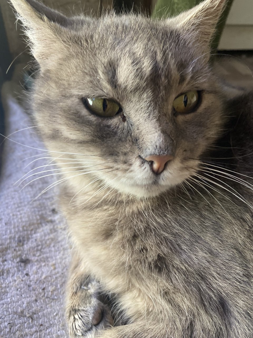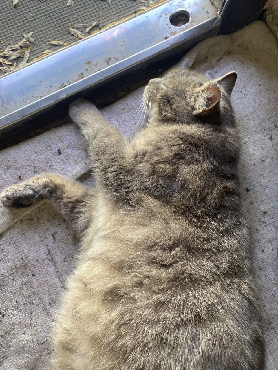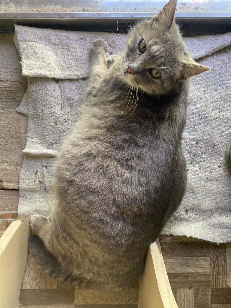 #моя донецкая киса. Киса собралась рожать, ходит, как чебурек на ножках, но больше полеживает у моих ног на пороге. Сильная женщина, не видавшая ни от кого ни помощи, ни доброго слова. Отцы-подлецы и дети, соответственно, лентяи и халявщики. Купил специального корма и добавок для беременных, купил половые тряпки в таких герметичных пакетиках, осталась только раздобыть "родильную коробку". Тут на помощь пришла армия, привезли ящик-укпорку от минометных мин 120 мм. Могли бы и от "Смерча" привезти... Ящик не полез в кисино убежище, завтра что-то придумаю.