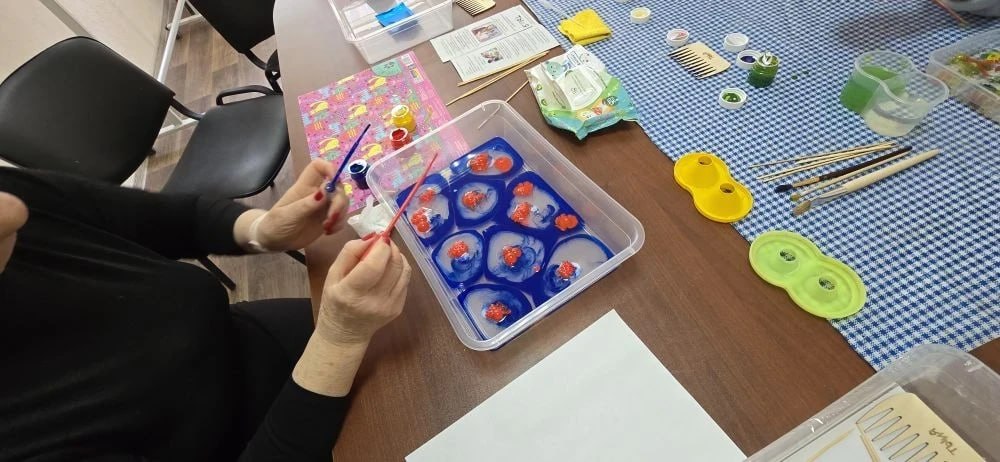 В Центре социального обслуживания населения Орджоникидзевского внутригородского района города Мариуполя в отделении дневного пребывания для граждан пожилого возраста и инвалидов прошел мастер-класс. Получатели услуг погрузились в удивительный мир Эбру - древнего искусства рисования на воде, которое активно используется как мощный метод арт-терапии.