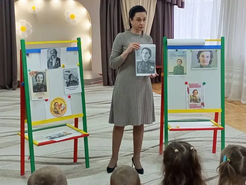 Маленькие воспитанники с большим интересом погрузились в удивительную биографию этой легендарной летчицы. Через яркие рассказы, красочные иллюстрации и увлекательные беседы дети узнали о том, как хрупкая девушка стала первой женщиной-Героем Советского Союза, покорившей небо.