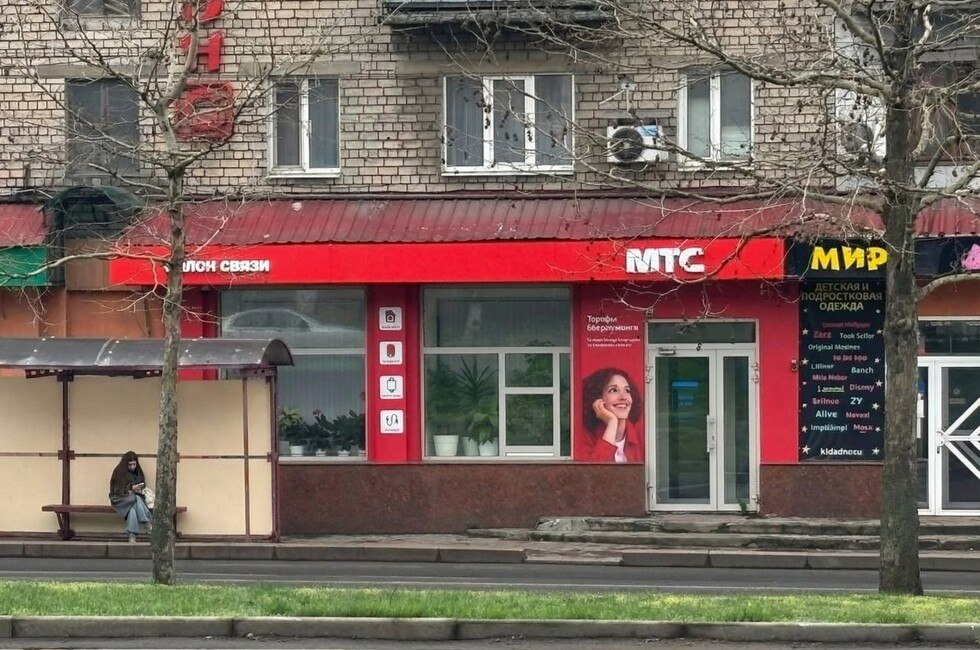 На бульваре Шевченко в Донецке работает салон связи в красно-белых тонах с характерным названием — визуально неотличимый от официальных точек «МТС» в других городах России.