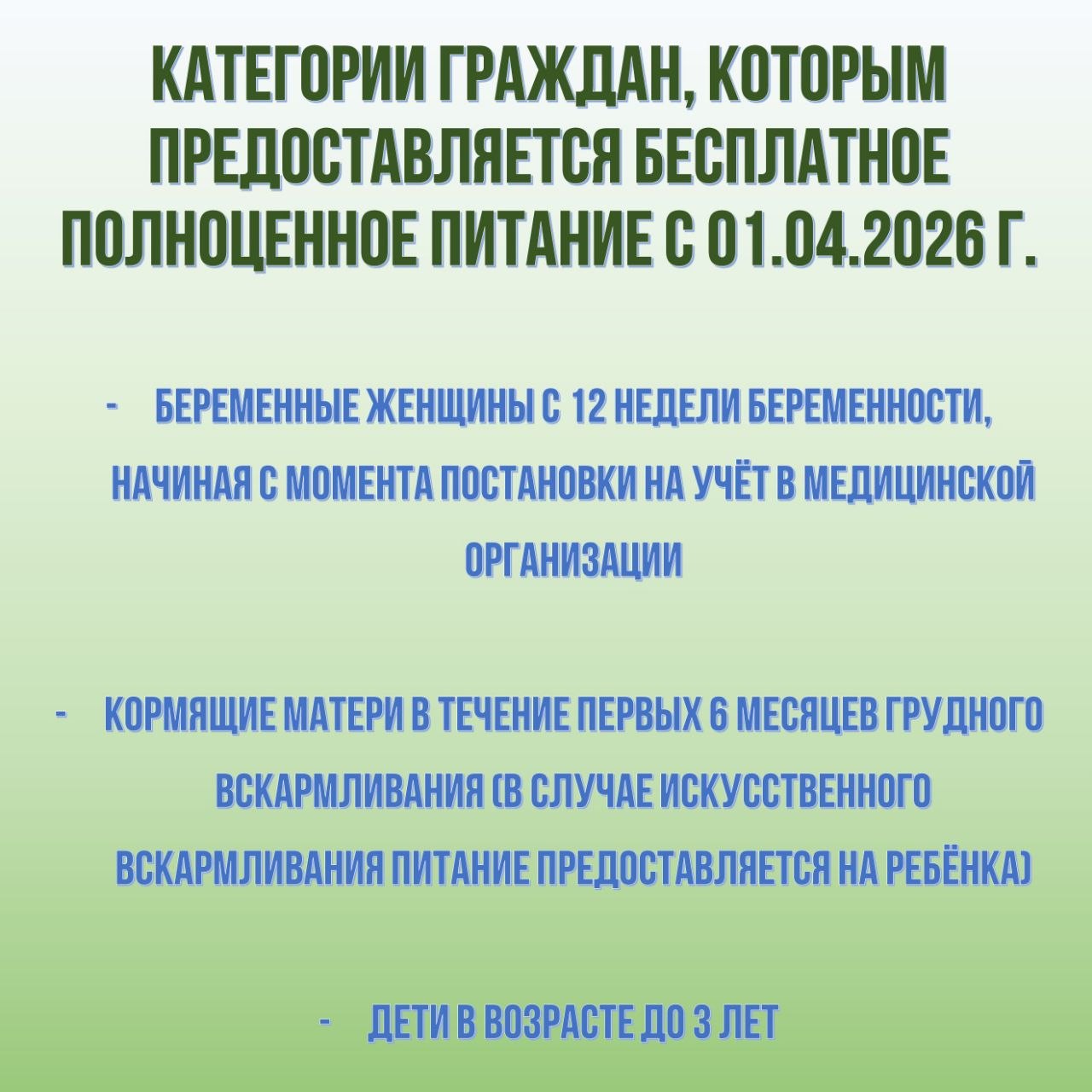 Ясиноватская центральная районная больница предоставляет бесплатное полноценное питание с 01.04.2026 для следующих категорий граждан:
