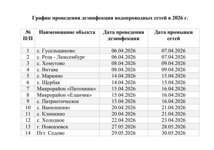 Обращаем ваше внимание, что в связи с проведением ежегодных санитарно-профилактических мероприятий на объектах водоснабжения, проводимых Новоазовской службой ГУП ДНР «ВОДА ДОНБАССА», будет осуществляться хлорирование и промывка водопроводных сетей в апреле-мае 2026 года.