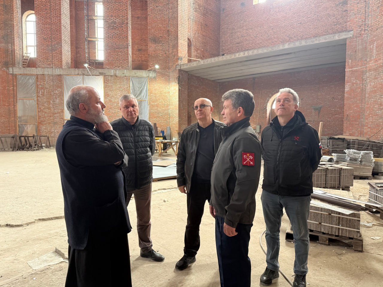 Собор Покрова Божьей Матери: Фасад, купола и остекление уже восстановлены. Идет работа над гранитным карнизом. В обновленном Соборе Покрова Божьей Матери вице-губернатор встретился с протоиереем Гавриилом Агабековым - настоятелем собора и Свято-Александро-Невского храма города Мариуполя.