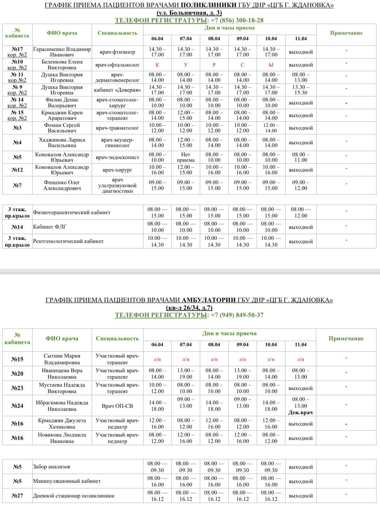 Актуальный график приема врачами амбулатории и поликлиники ГБУ ДНР «ЦГБ г. Ждановка» с 06.04.2026 по 12.04.2026