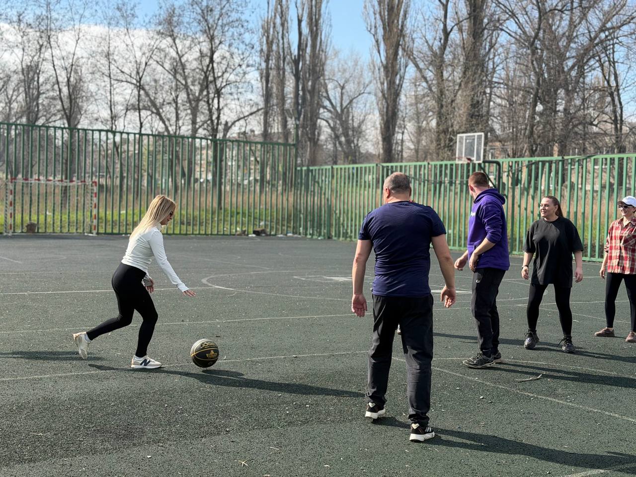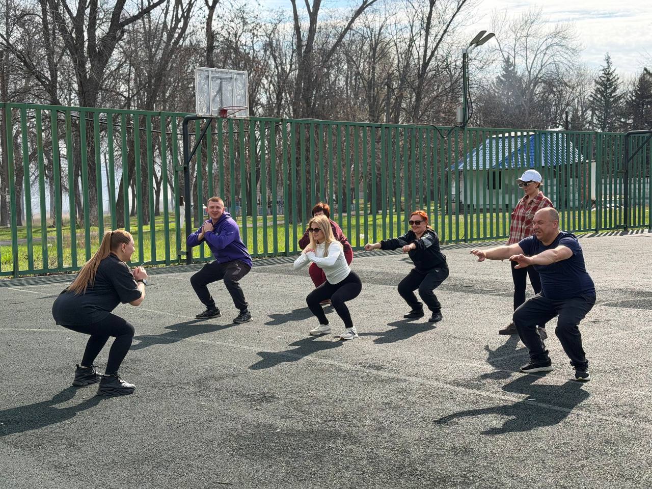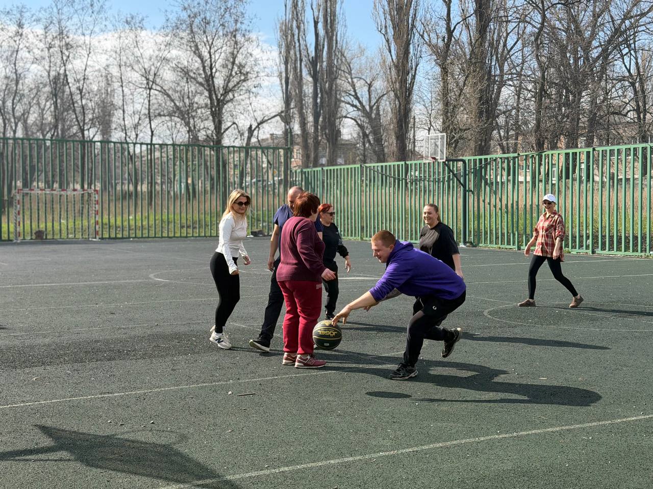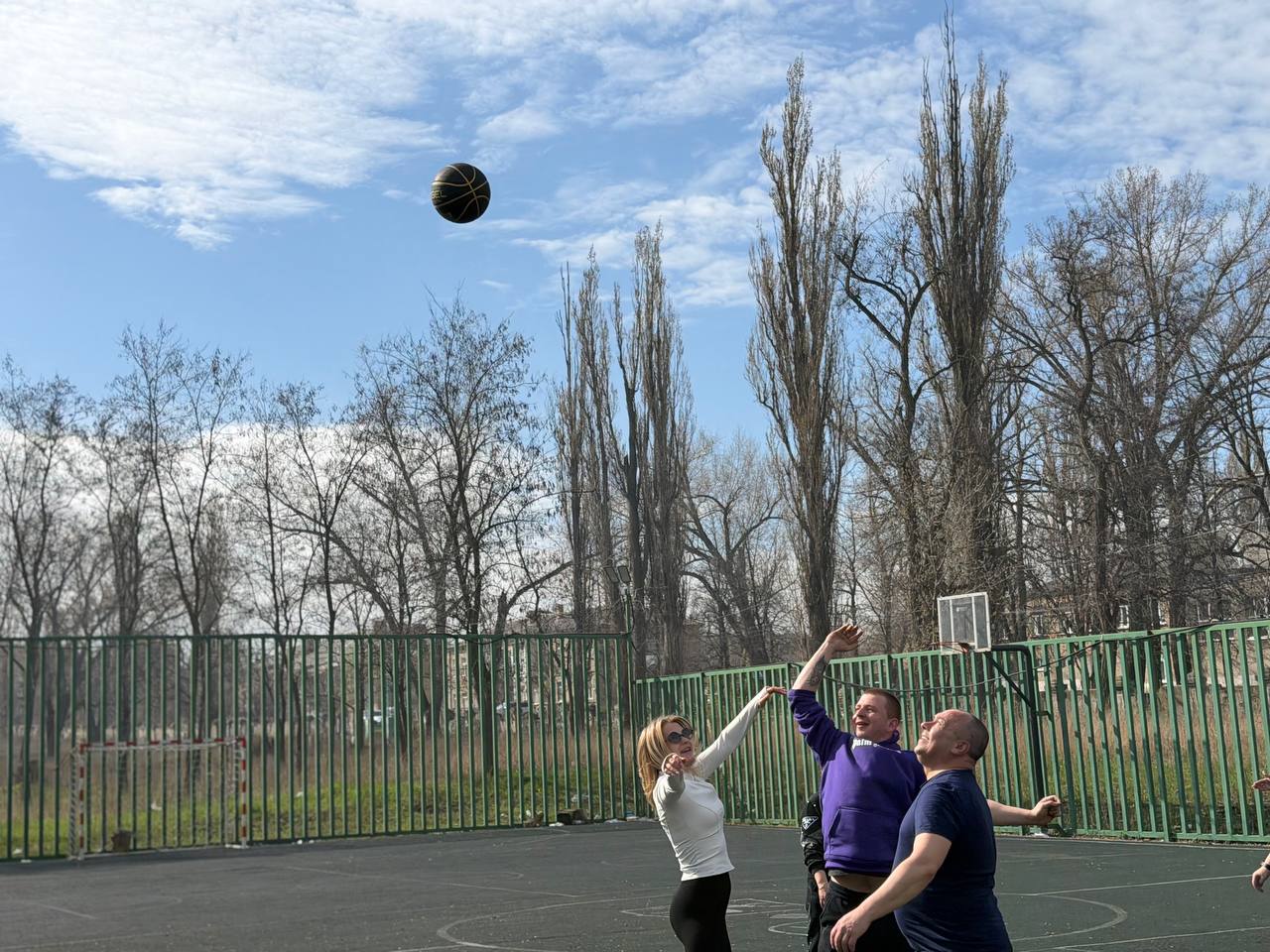 Так, сотрудники администрации провели спортивную зарядку на свежем воздухе, а в завершении сыграли в баскетбол .