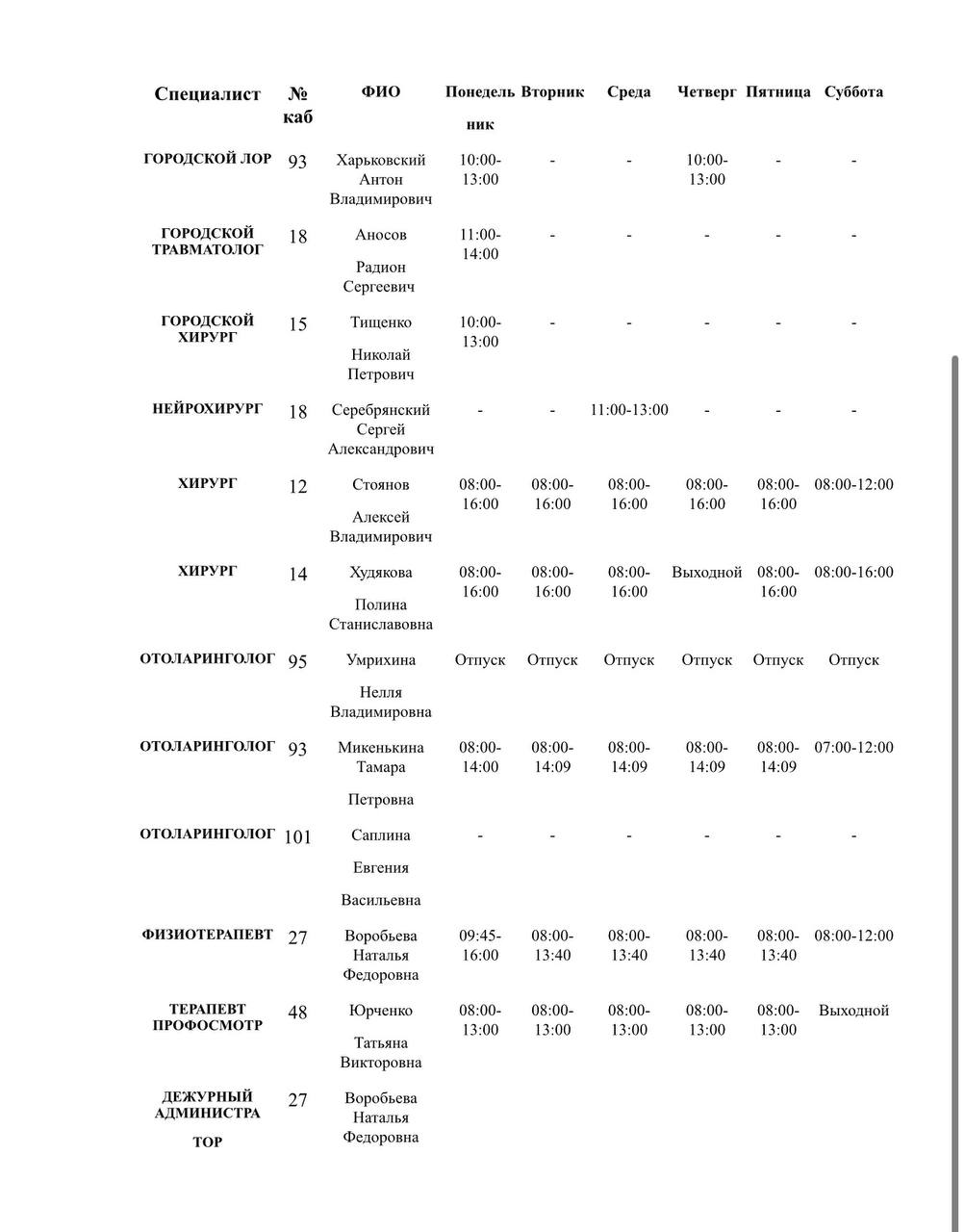 График работы специалистов ГБУ ДНР «Городская больница № 3 г. Горловки»