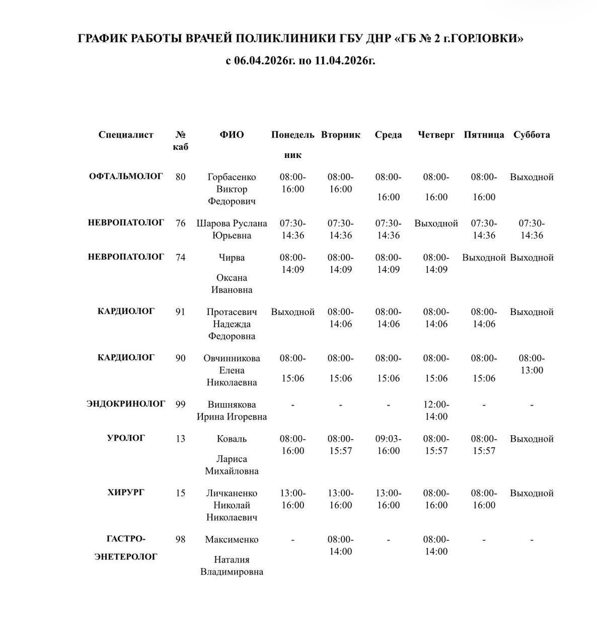 Иван Приходько: График работы специалистов ГБУ ДНР «Городская больница № 1 г. Горловки», ГБУ ДНР «Городская больница № 2 г. Горловки»