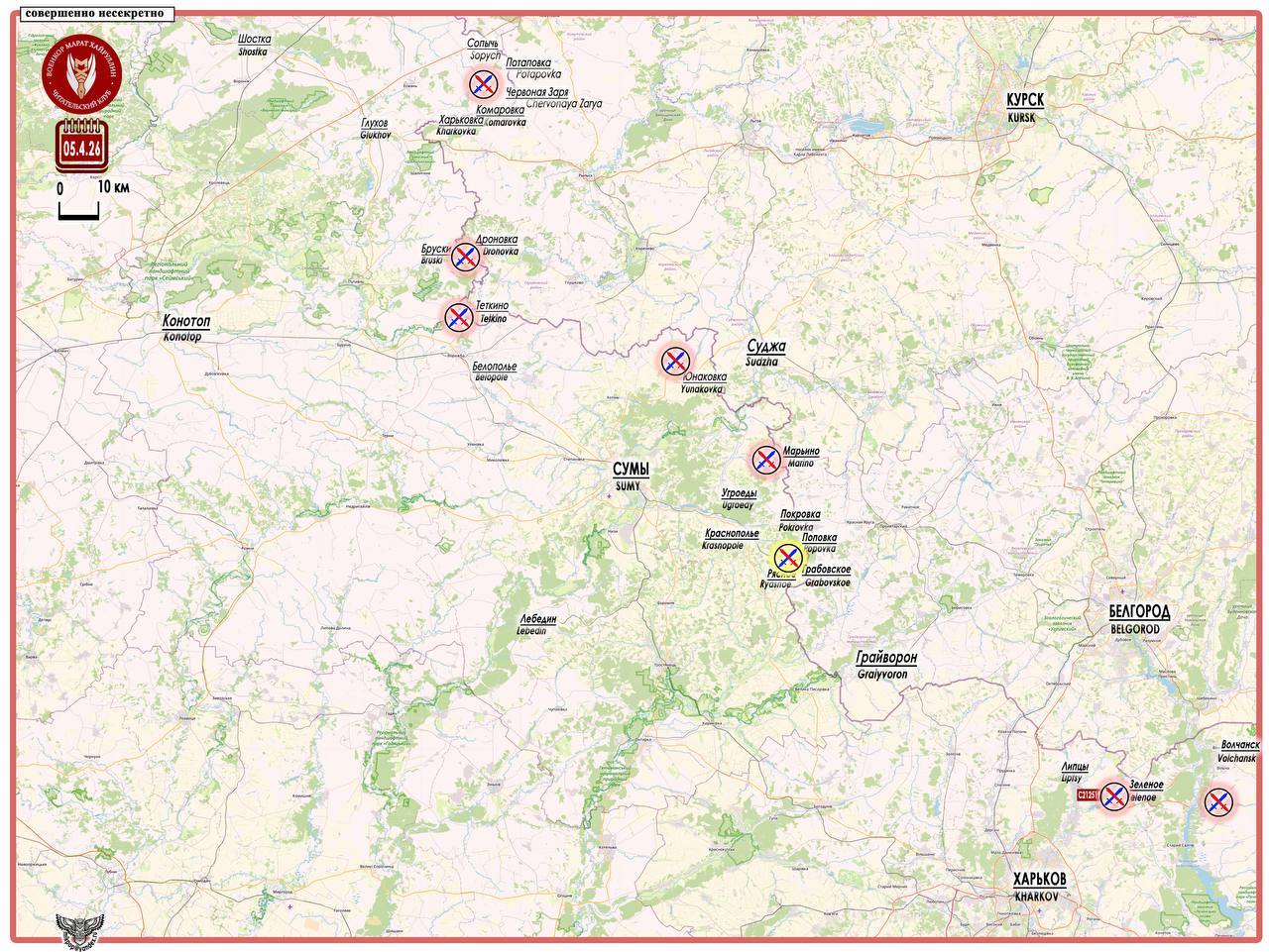 На центральном участке Сумского направления после активных действий на правом фланге (район Покровское) подразделения группировки «Север» продвинулись на левом фланге (южнее н.п. Грабовское) на расстояние около 3 километров и вышли на рубеж реки Корова, направлением в стык участков обороны ВСУ Высокое -Рясное и Майское - Мезенковка - Славгород. За рекой рокада О-190607, обеспечивающая взаимодействие этих участков.