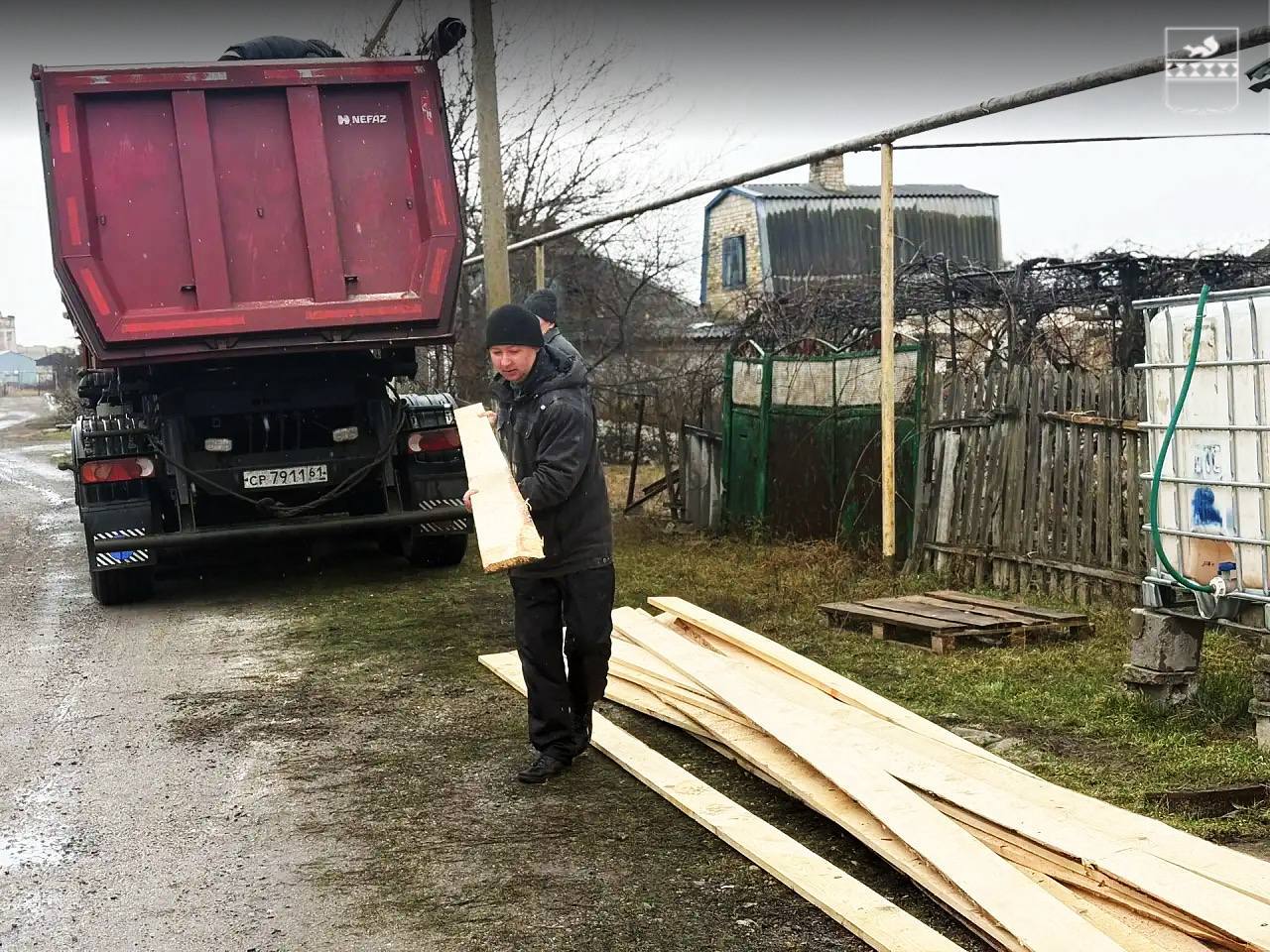 В семье растёт 12-летний мальчик особой заботы. Папа один воспитывает сына. В этот раз дорожники передали подшефным строительные материалы для ремонта дома — шифер, доску, отсев и цемент.