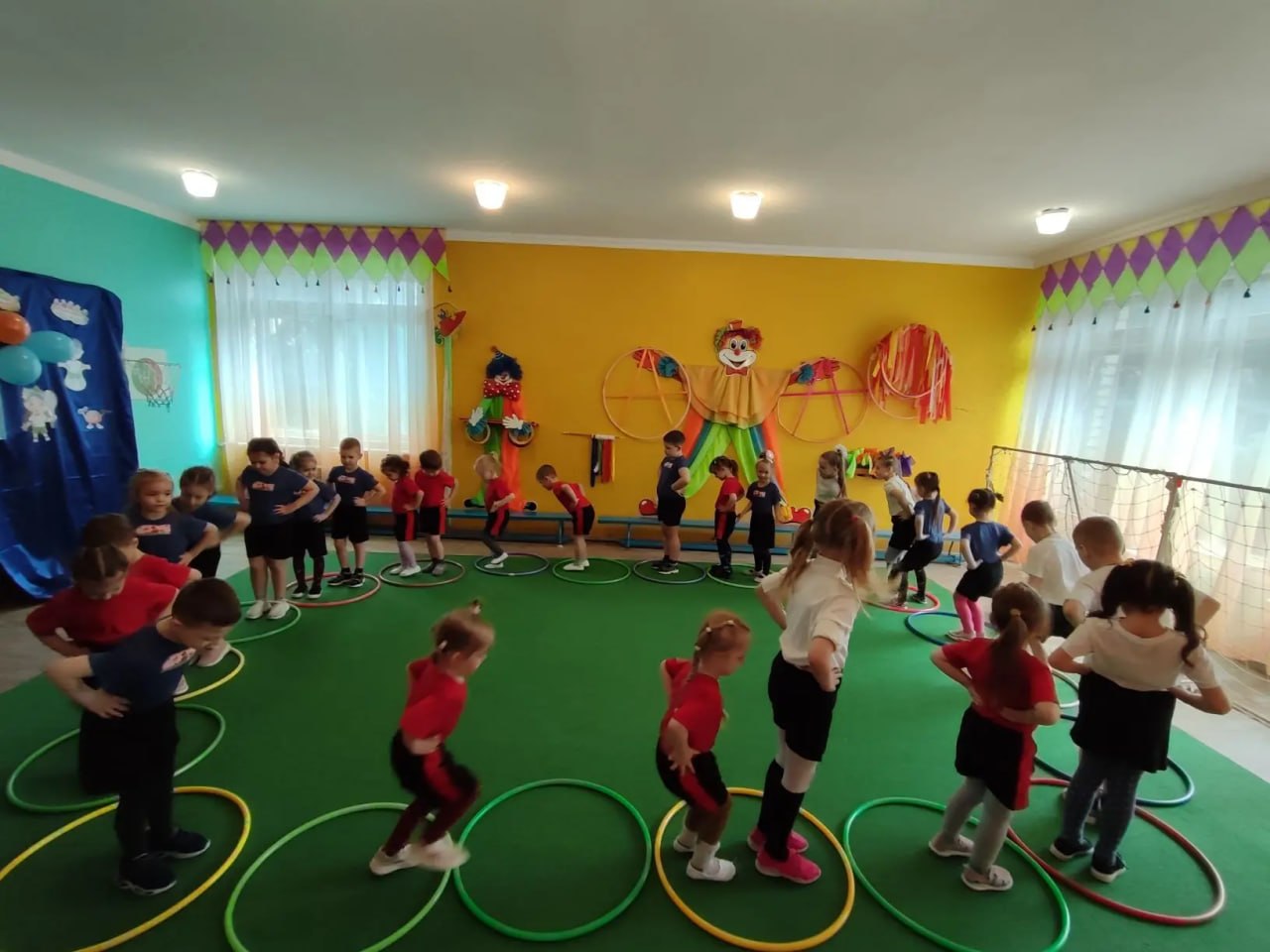 Спортивный зал превратился в арену для юных атлетов, где под веселую музыку дети с азартом соревновались в увлекательных эстафетах. Бег с мячом, прыжки и передача палочки требовали от малышей не только ловкости, но и командного духа. Глаза ребят горели, лица сияли улыбками, а атмосфера дружбы и поддержки царила повсюду.