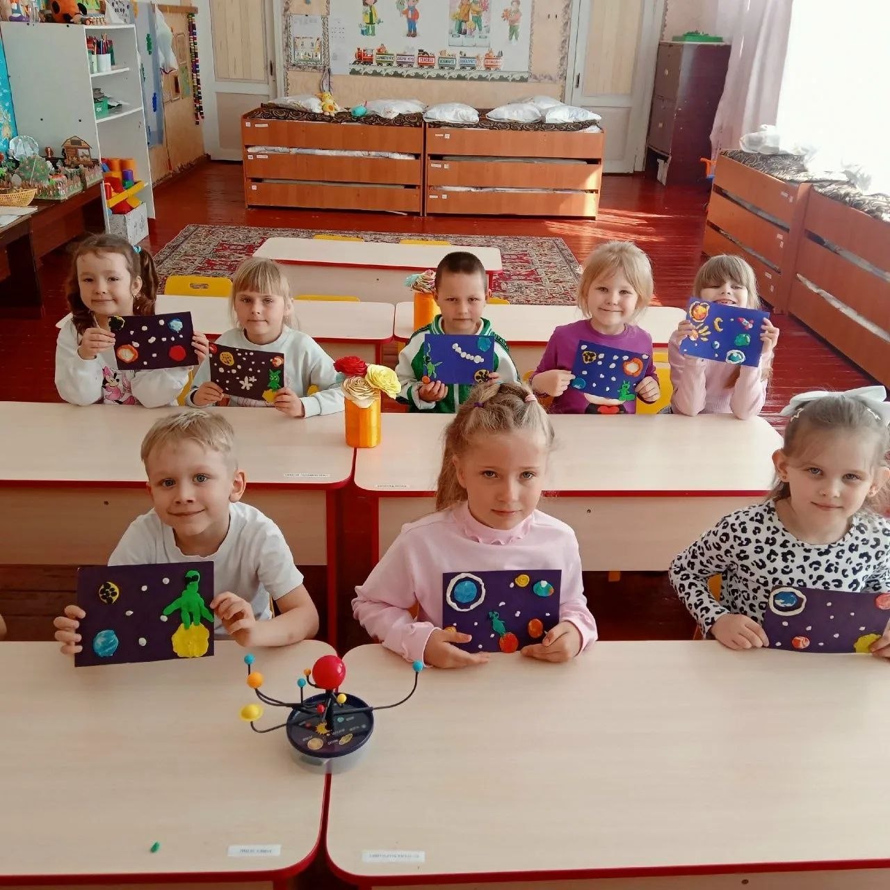 Воспитанники старшей группы «Непоседы» Новоазовского детского сада «Соловушка» создали удивительные аппликации в технике пластилинографии, изобразив планеты в бескрайнем космосе. Каждый ребёнок с увлечением и фантазией подошёл к работе, создав свой собственный, неповторимый космический мир.