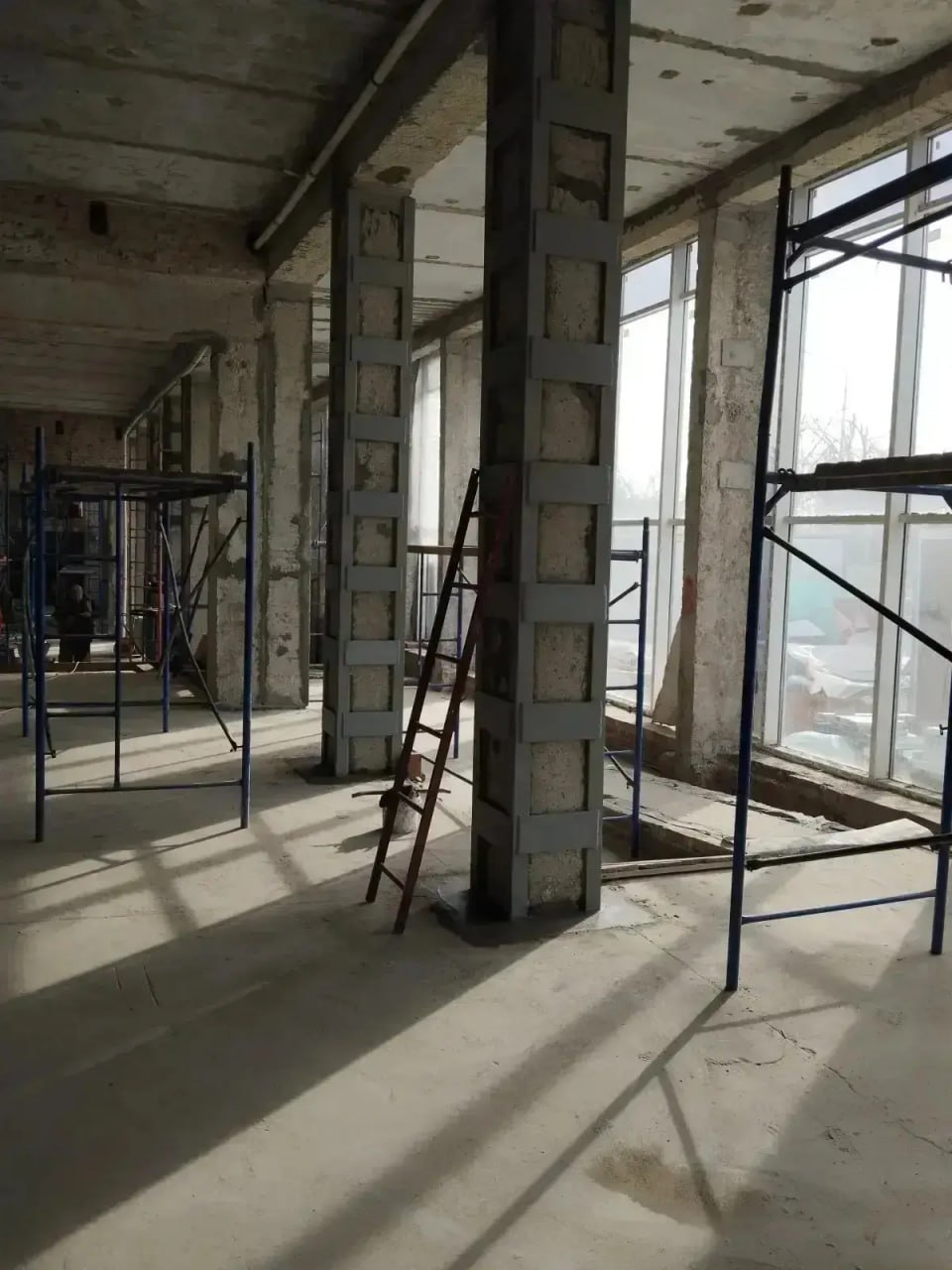 В здании на проспекте Металлургов специалисты усиливают колонны металлической обоймой и ведут устройство каркаса стен из профилей.