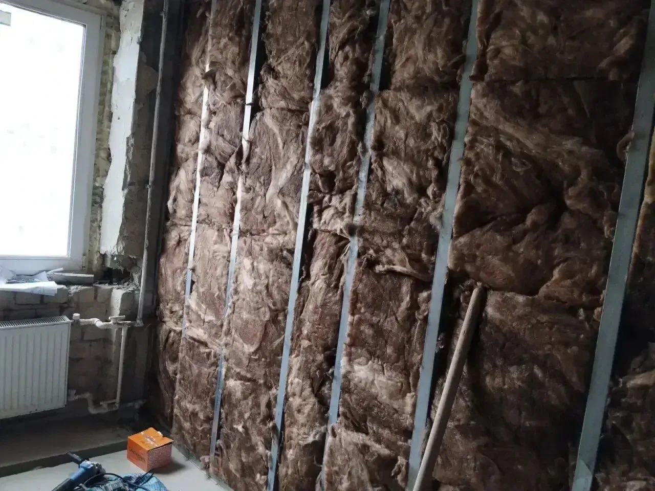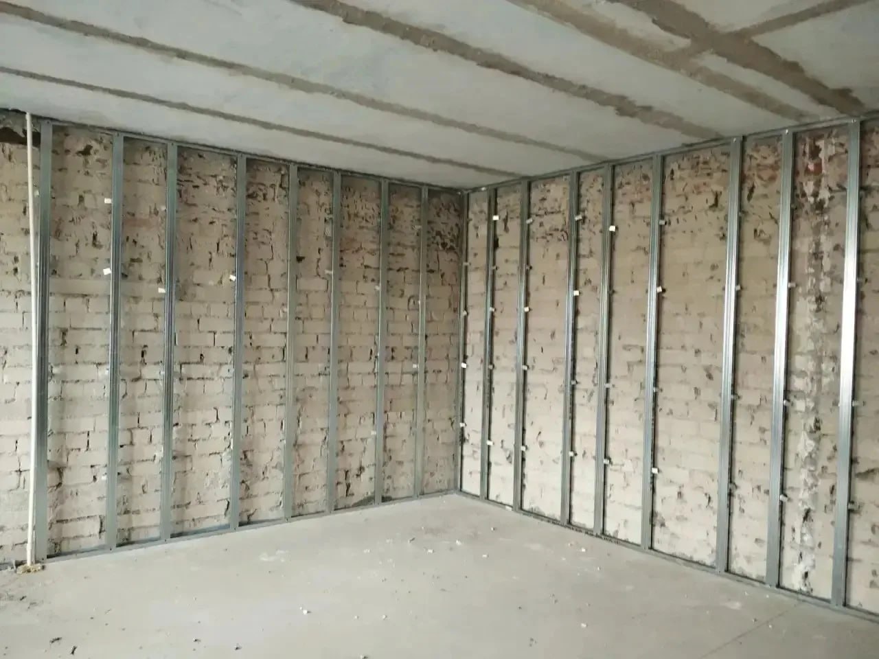 Параллельно идет прокладка кабеля в гофре по стенам, зачистка колонн и арматурных стержней.