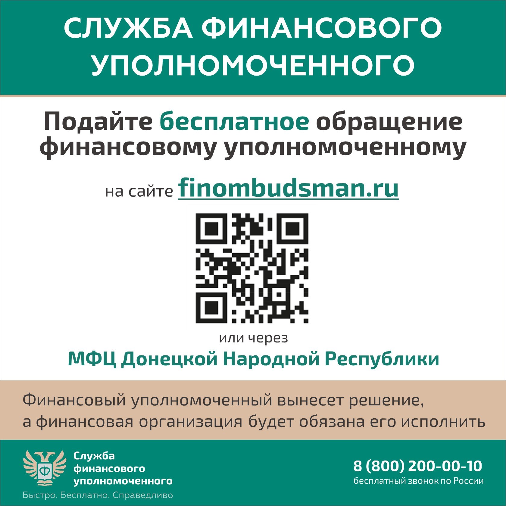 Если спор с финансовой организацией не урегулирован – подайте обращение финансовому уполномоченному на его официальном сайте или через МФЦ Донецкой Народной Республики.